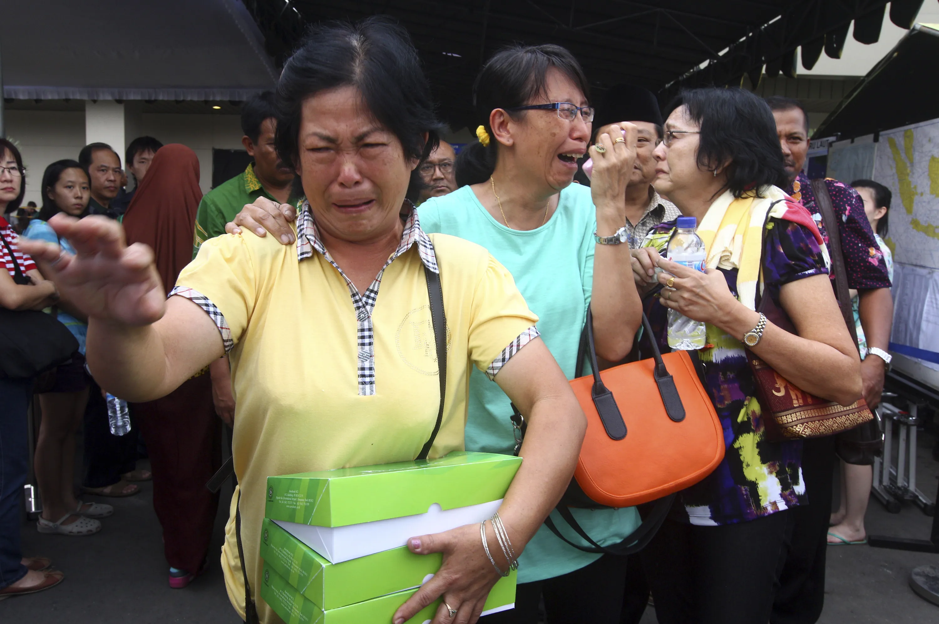 Relatives of passengers of AirAsia Flight 8501 cry after visiting the crisis center at Juanda International Airport in Surabaya, East Java, Indonesia, Wednesday, December 31, 2014. The first proof of the jet's fate emerged Tuesday in an area not far from where it dropped off radar screens on Sunday morning. Searchers found bodies and debris that included a life jacket, an emergency exit door and a suitcase about 10 miles from the plane's last known coordinates. (Photo by Firdia Lisnawati/AP Photo)