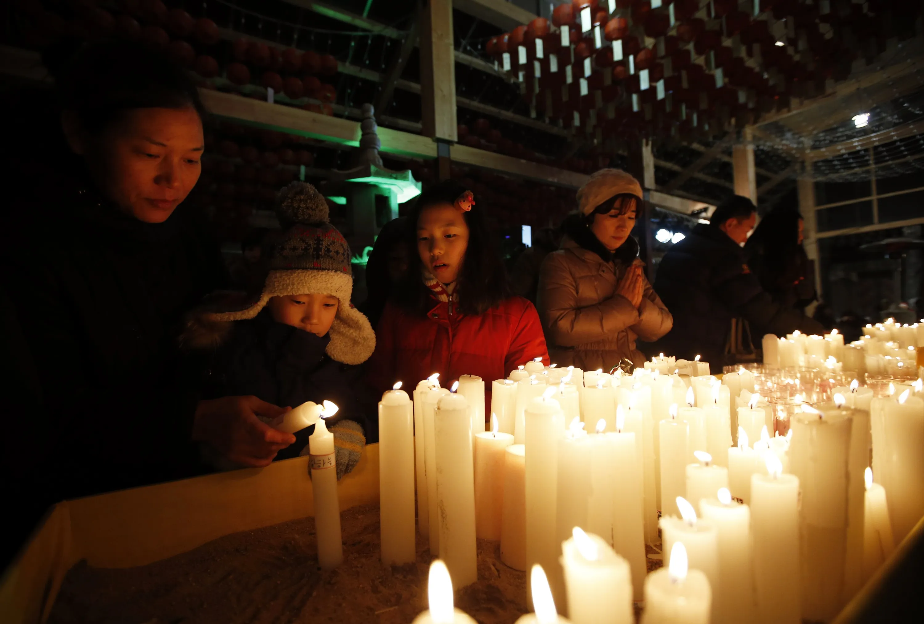 A boy lights a candle with his mother before a ceremony to celebrate the new year at Bongeun Buddhist temple in Seoul December 31, 2014. (Photo by Kim Hong-Ji/Reuters)