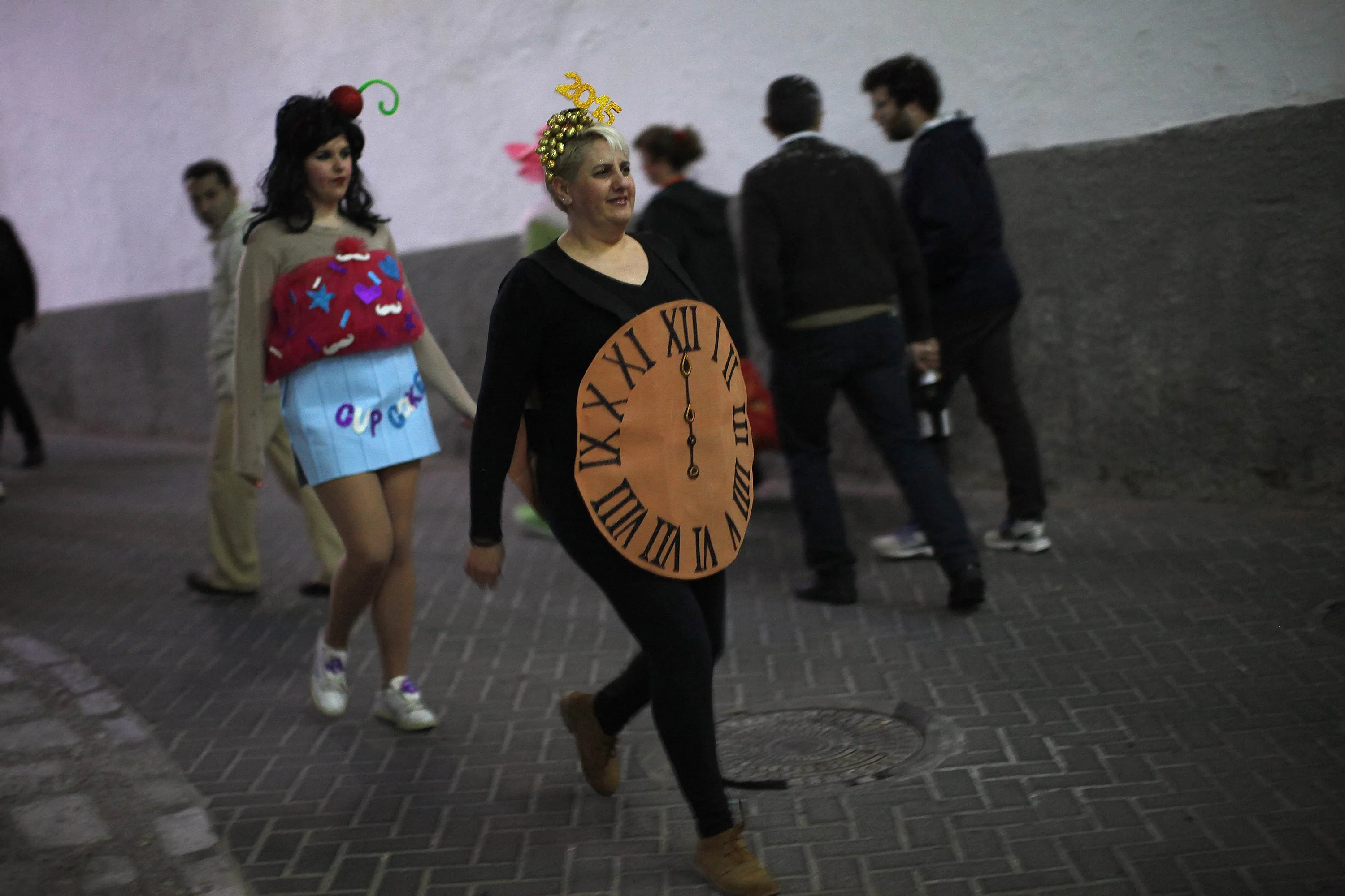 Revellers dressed up as a watch and a cupcake take part in New Year's celebrations in Coin, near Malaga, southern Spain, early January 1, 2015. (Photo by Jon Nazca/Reuters)