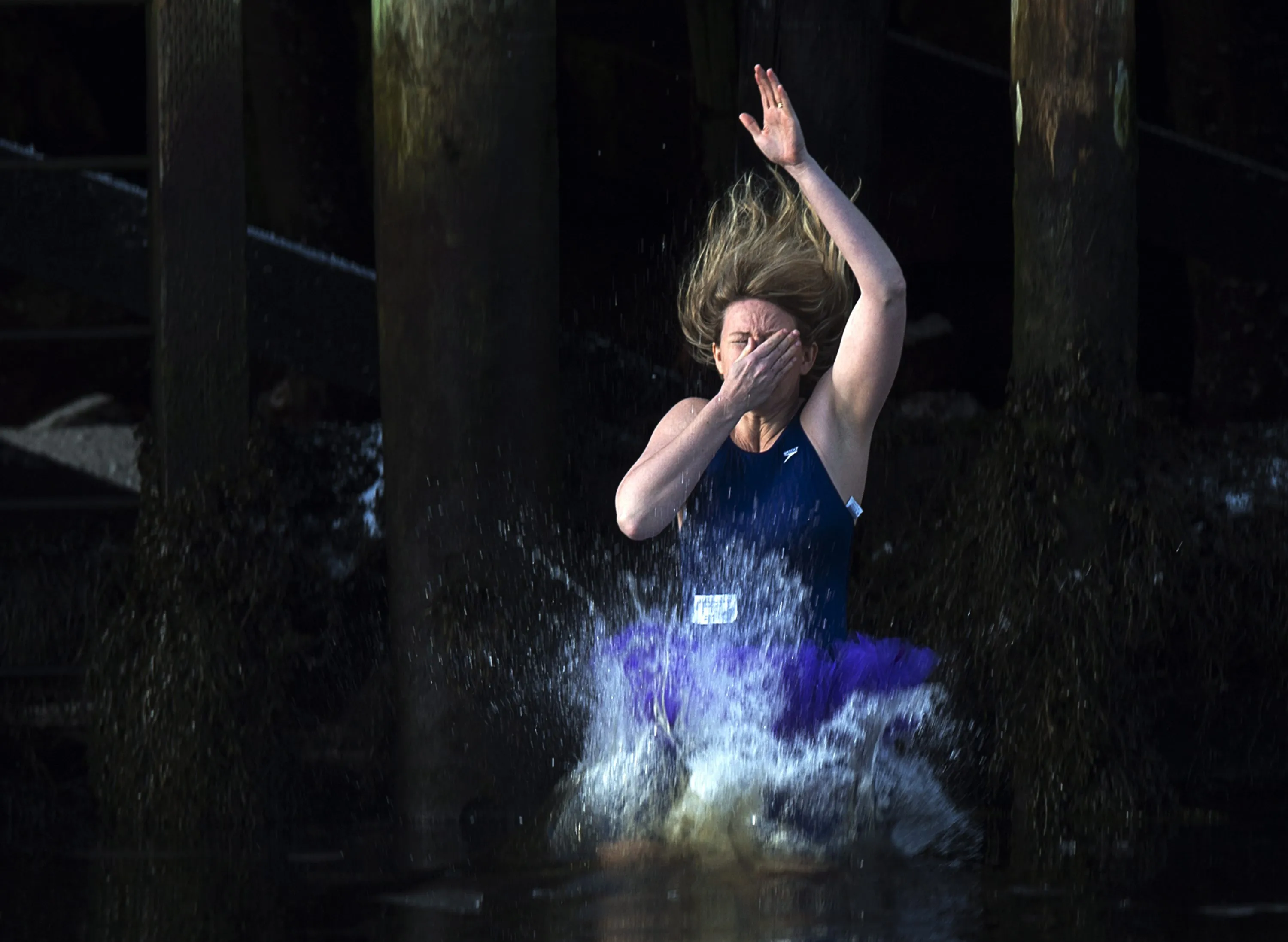 A woman plugs her nose as she leaps from the government wharf into the frigid North Atlantic in the annual New Year's Day polar bear swim in Herring Cove, Nova Scotia, Canada, on Thursday, January 1, 2015. (Photo by Andrew Vaughan/AP Photo/The Canadian Press)