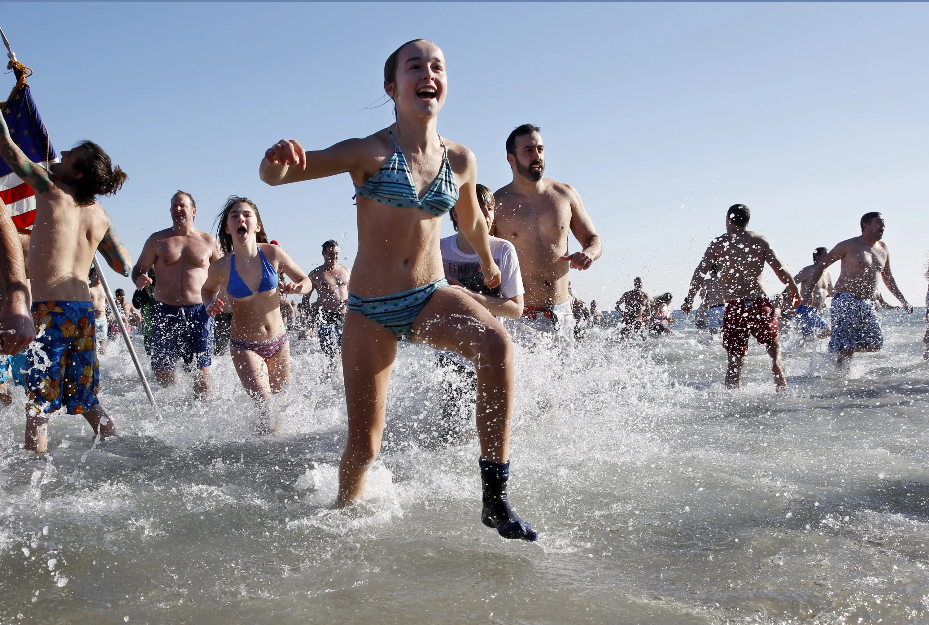 People run in the cold Atlantic Ocean during the Sons of Ireland's annual New Year's Day Polar Bear Plunge on a sunny, but frigid Thursday, January 1, 2015, in Asbury Park, N.J. (Photo by Mel Evans/AP Photo)