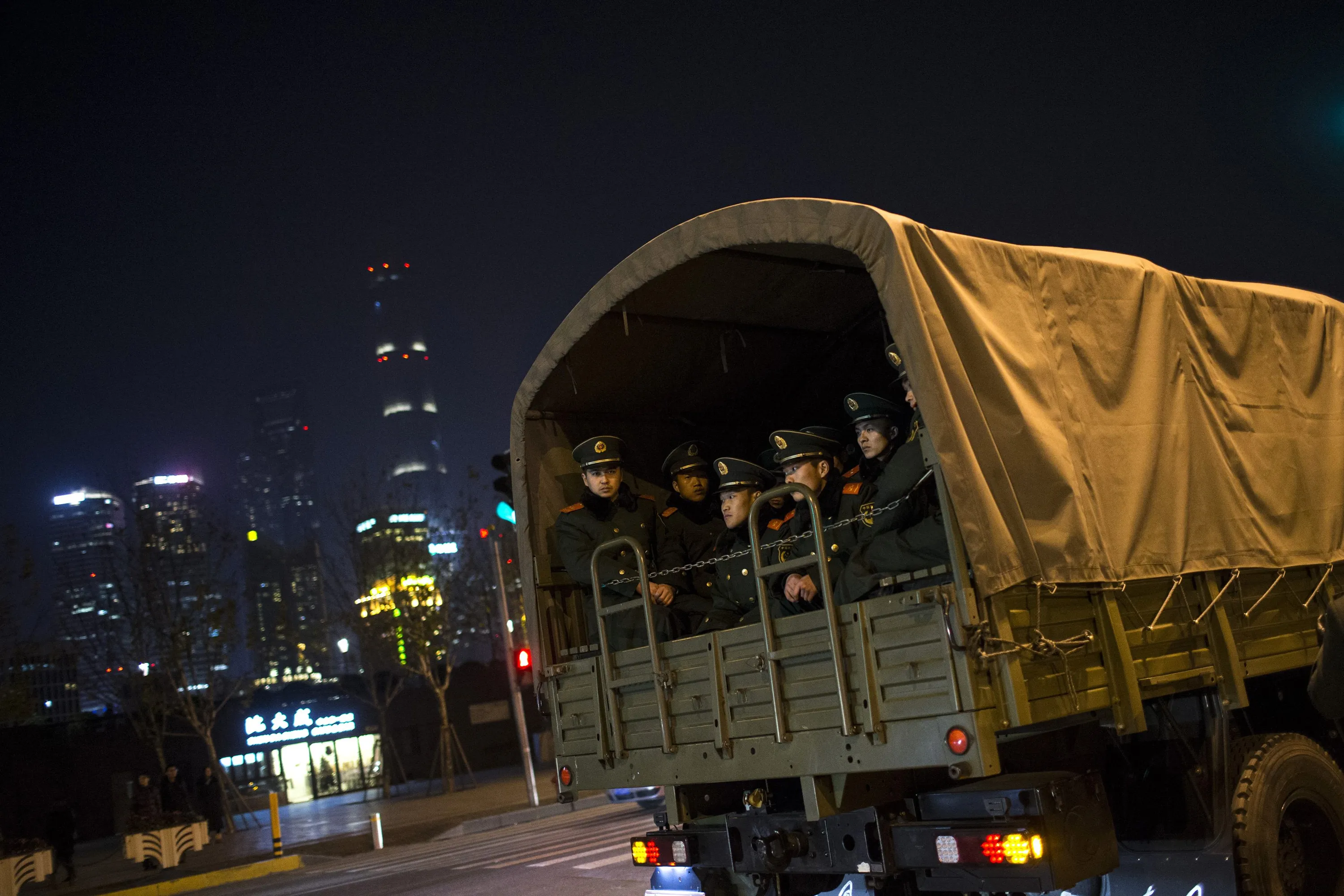 Paramilitary police officers sit on a truck leaving the location where people were killed in a stampede incident during a New Year's celebration on the Bund, in Shanghai January 1, 2015. (Photo by Aly Song/Reuters)