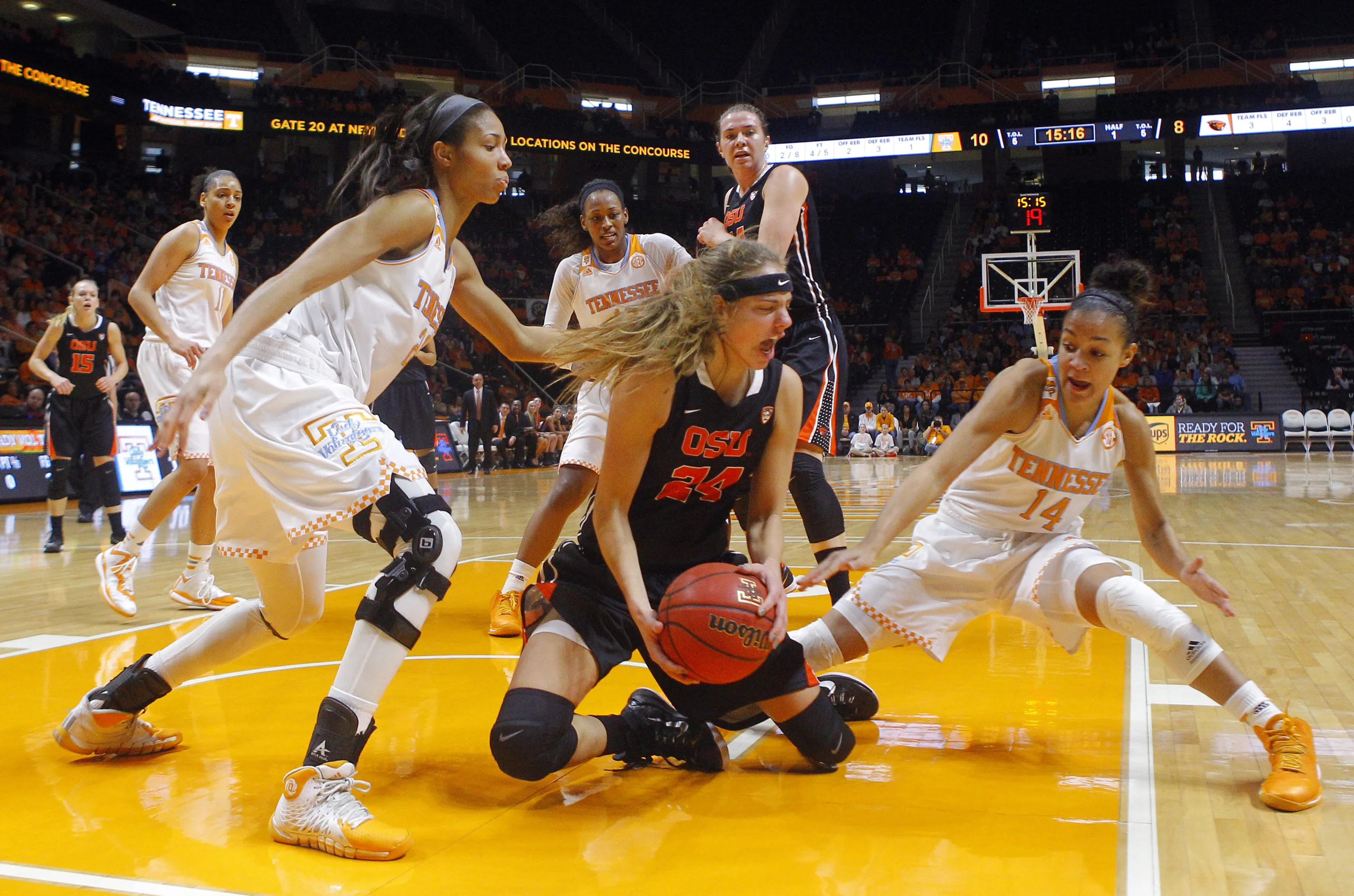 Oregon State guard Sydney Wiese (24) battles for the ball with Tennessee guard Andraya Carter (14) and center Isabelle Harrison (20) in the first half of an NCAA college basketball game Sunday, December 28, 2014, in Knoxville, Tenn. (Photo by Wade Payne/AP Photo)