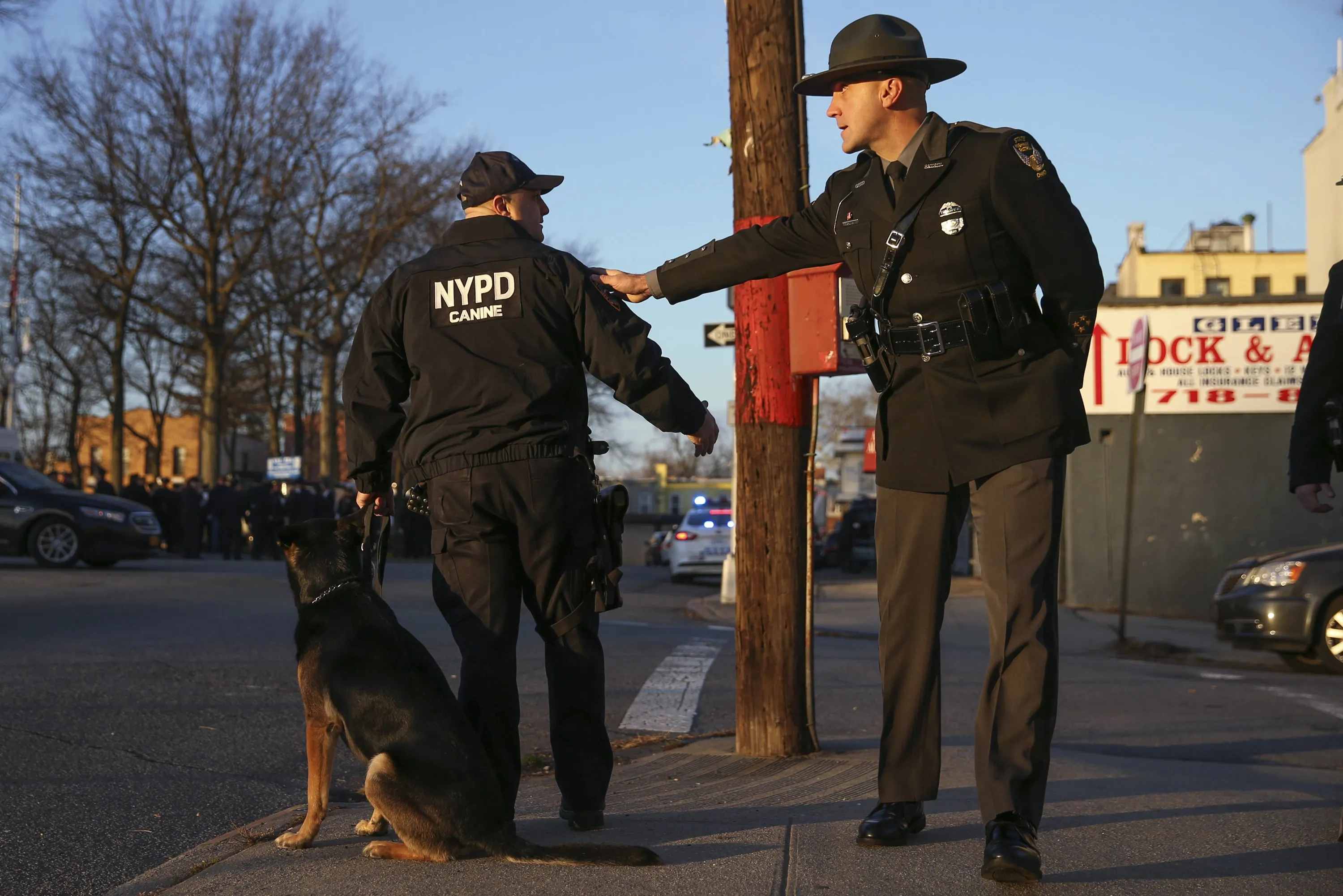 An Ohio State Highway patrol officer (R) puts his hand on the shoulder of an NYPD Canine unite officer upon arriving for the funeral of NYPD officer Rafael Ramos, at Christ Tabernacle Church in Queens, New York December 27, 2014. Thousands of police and other mourners were expected to fill the church and surrounding streets for the funeral Saturday of Ramos, one of two police officers ambushed by a gunman who said he was avenging the killing of unarmed black men by police. (Photo by Shannon Stapleton/Reuters)
