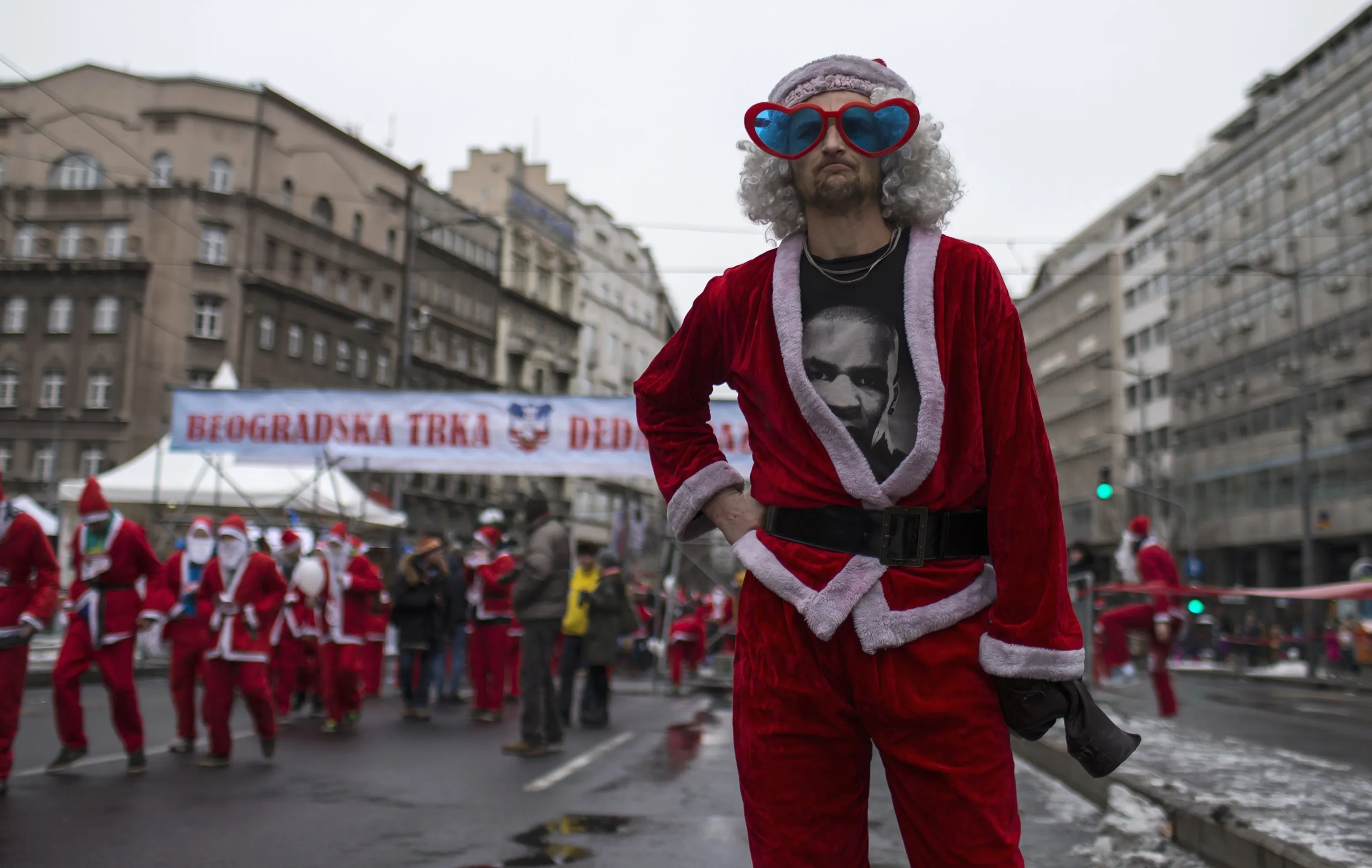 A man in a Santa Claus costume waits for the start of the annual race in downtown Belgrade December 28, 2014. Serbian Orthodox believers celebrate Christmas on January 7, according to the Julian calendar. The Julian calendar is two weeks behind the Gregorian calendar. (Photo by Marko Djurica/Reuters)