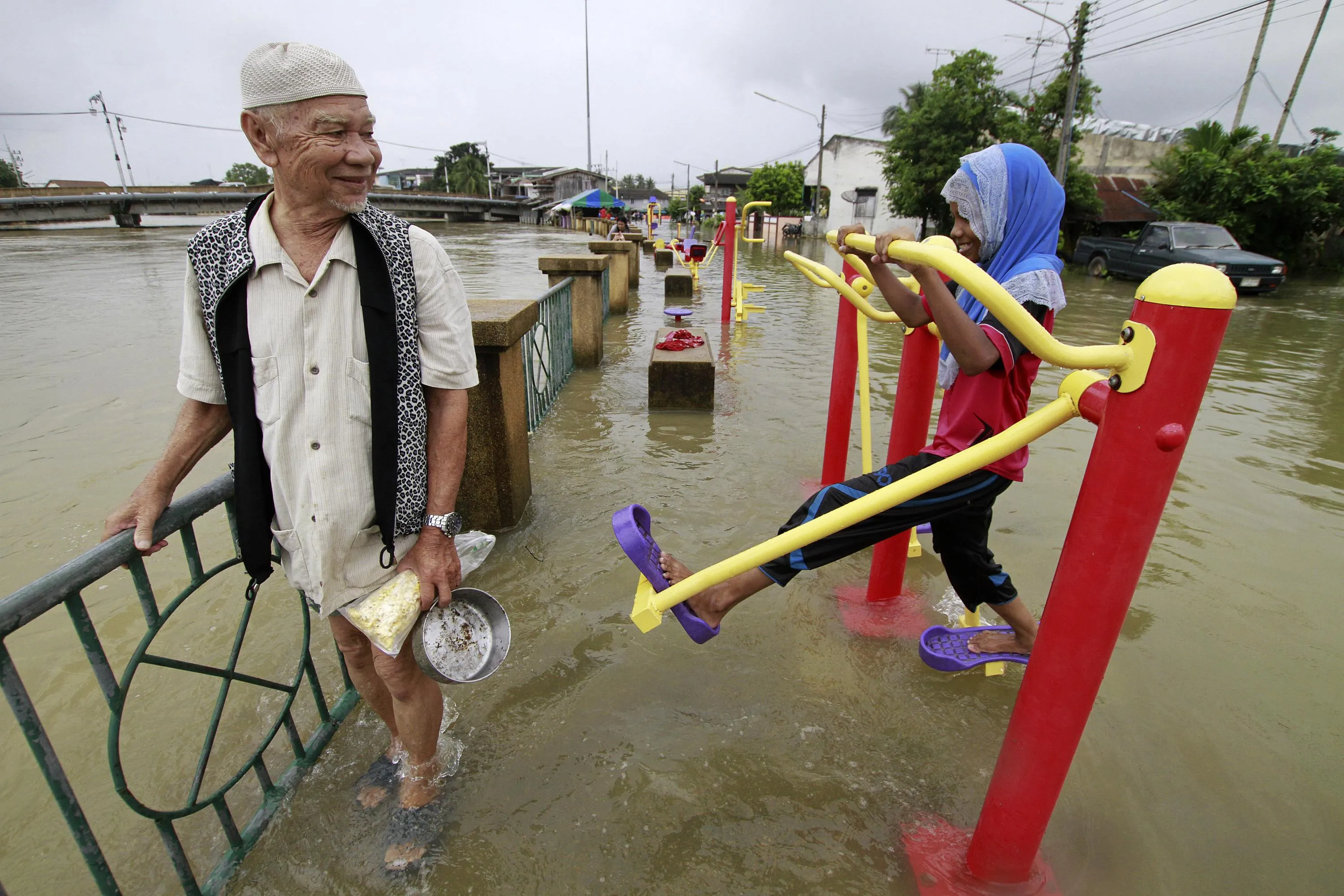 A man wades through a flooded street as a girl uses an exercise machine in the Pattani province December 29, 2014. Many parts of Thailand's southern provinces remain flooded and more heavy rains and strong winds were expected until the New Year, local media reported. (Photo by Surapan Boonthanom/Reuters)