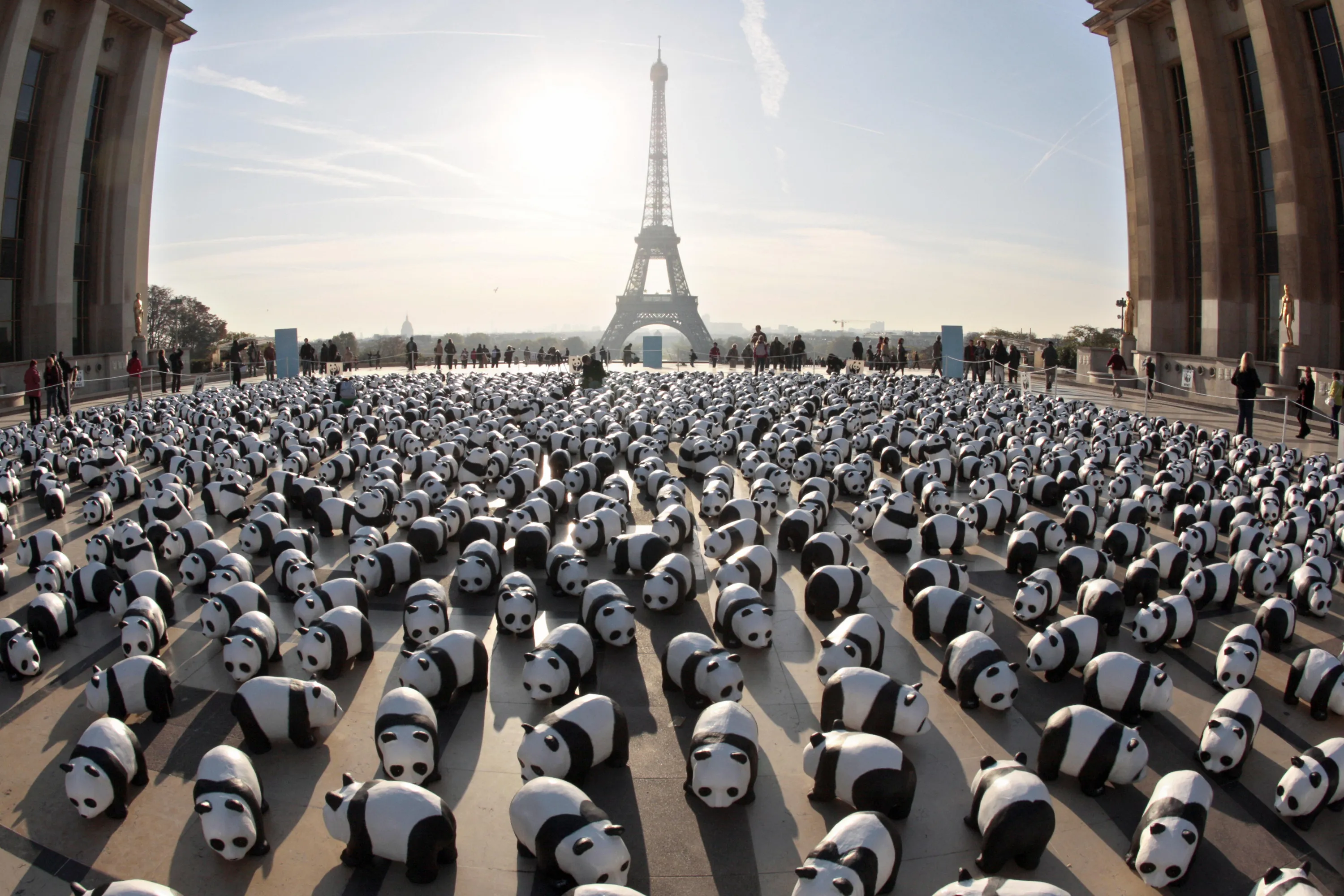 1,600 paper mache pandas set up by members of WWF (World Wildlife Fund) are pictured on October 18, 2008 on the Parvis des droits de l'Homme at Paris Trocadero esplanade to symbolize there are only 1600 pandas left on earth and to call people to do their part in helping to reverse the deterioration of our natural environment. (Photo by Francois Guillot/AFP Photo)