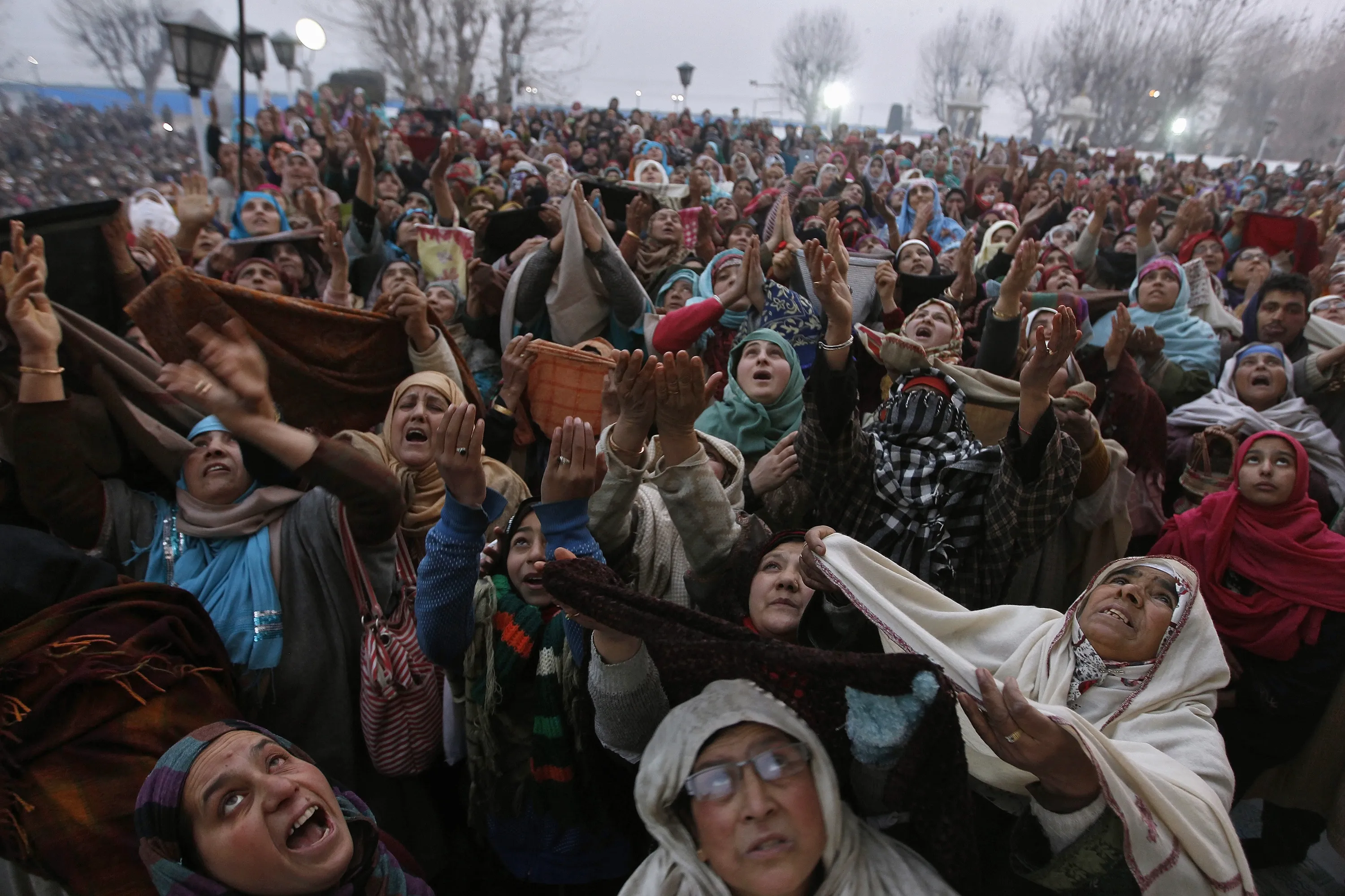 Kashmiri Muslim women raise their arms upon seeing a relic of Prophet Mohammad being displayed to devotees during the festival of Eid-e-Milad, at Hazratbal shrine on a cold winter morning in Srinagar January 4, 2015. (Photo by Danish Ismail/Reuters)