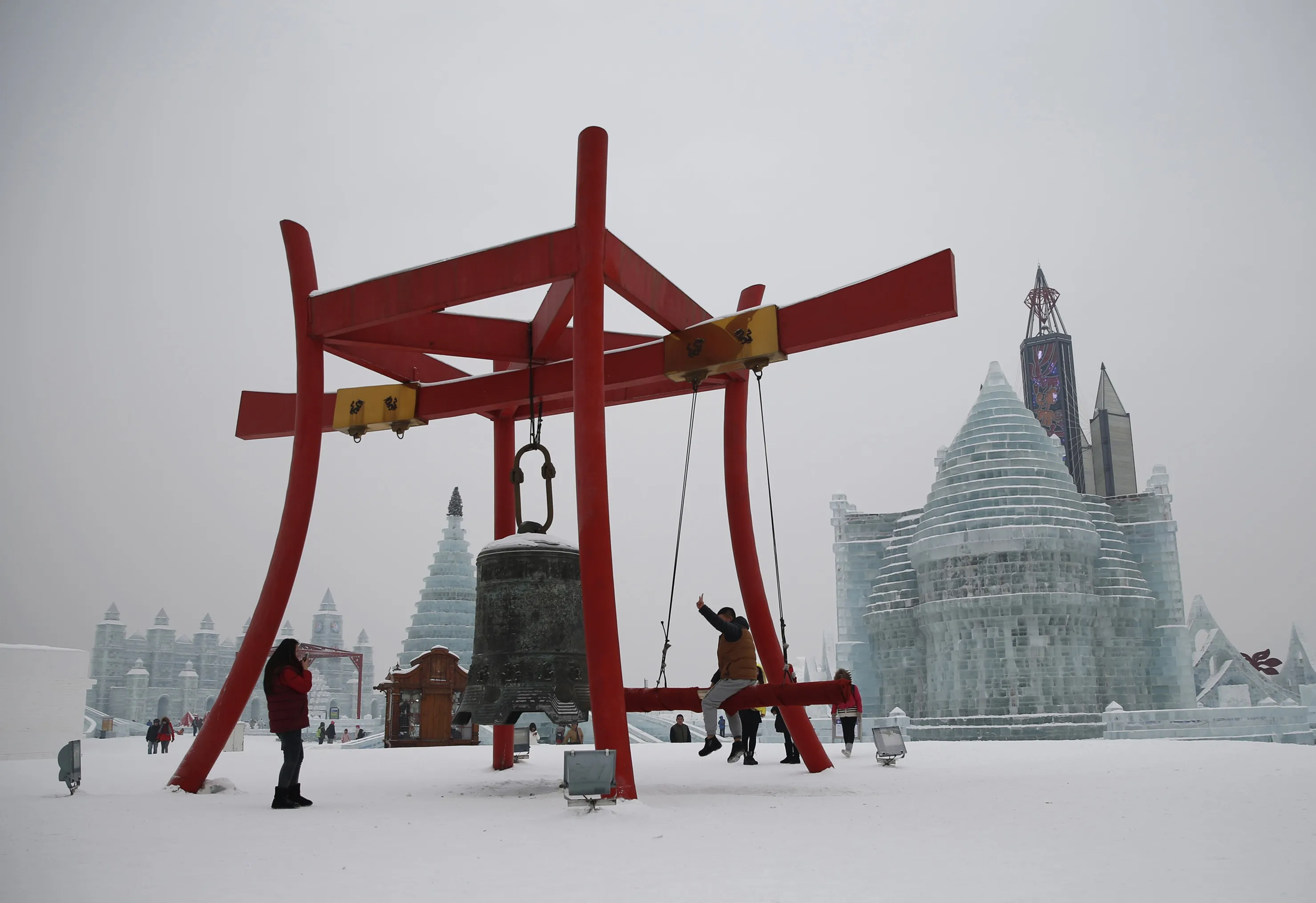 Visitors take pictures with a bell which is displayed with ice sculptures ahead of the 31st Harbin International Ice and Snow Festival in the northern city of Harbin, Heilongjiang province, January 4, 2015. (Photo by Kim Kyung-Hoon/Reuters)