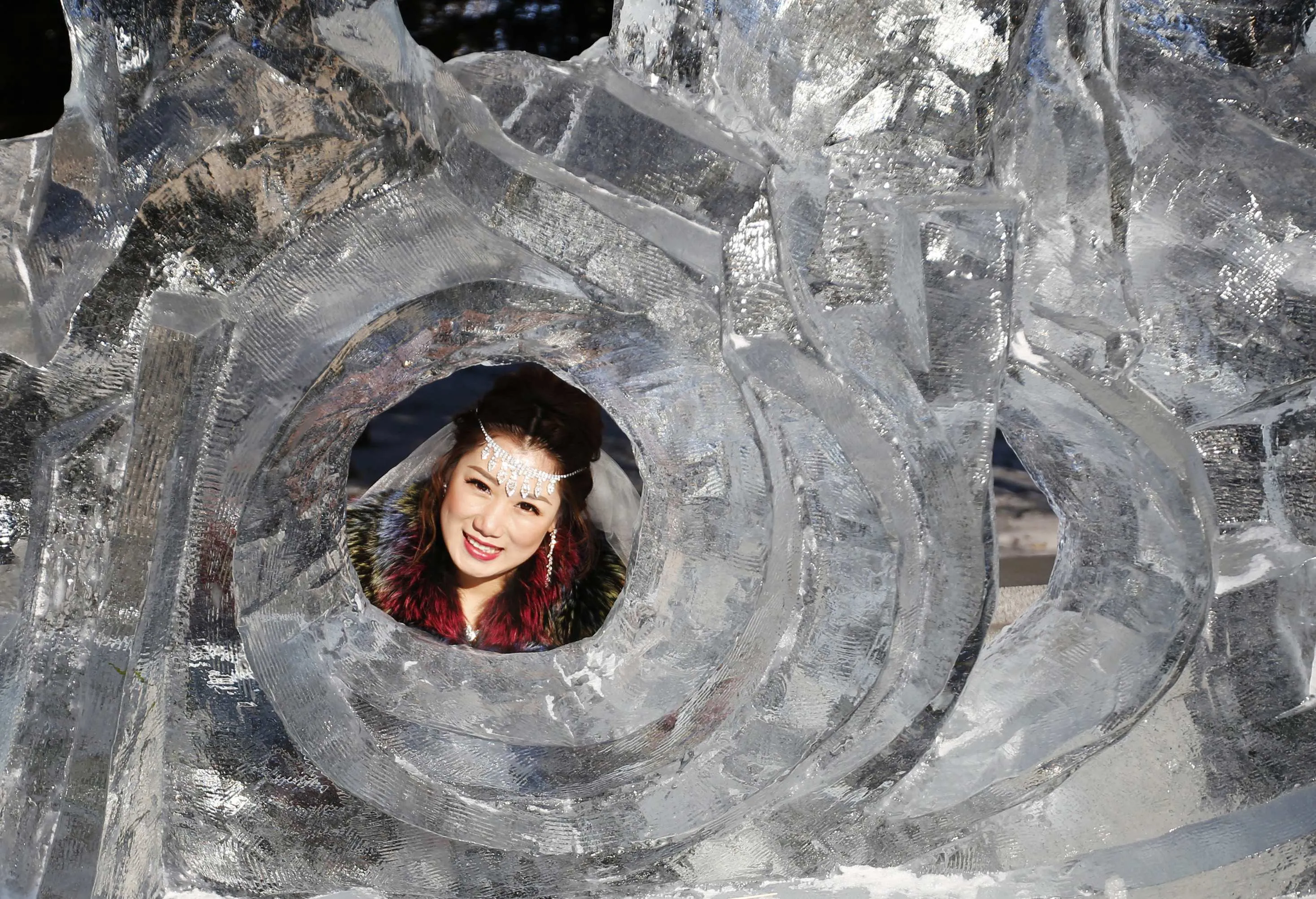 A newly-wed bride poses for her wedding photographs with an ice sculpture after a group wedding ceremony which was held as a part of the Harbin International Ice and Snow Festival in the northern city of Harbin, Heilongjiang province January 6, 2015. (Photo by Kim Kyung-Hoon/Reuters)
