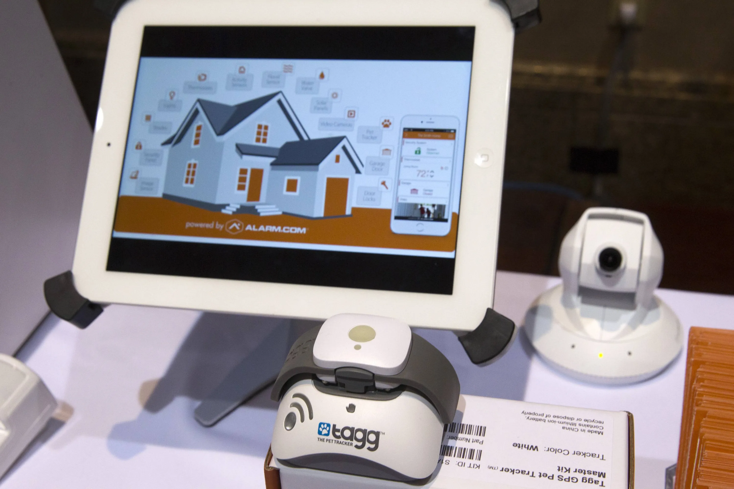 A Tagg pet tracker is shown at an Alarm.com booth during the 2015 International Consumer Electronics Show (CES) in Las Vegas, Nevada January 4, 2015. A new partnership between the companies incorporates pet tracking features with the home automation functions of Alarm.com Apps. (Photo by Steve Marcus/Reuters)