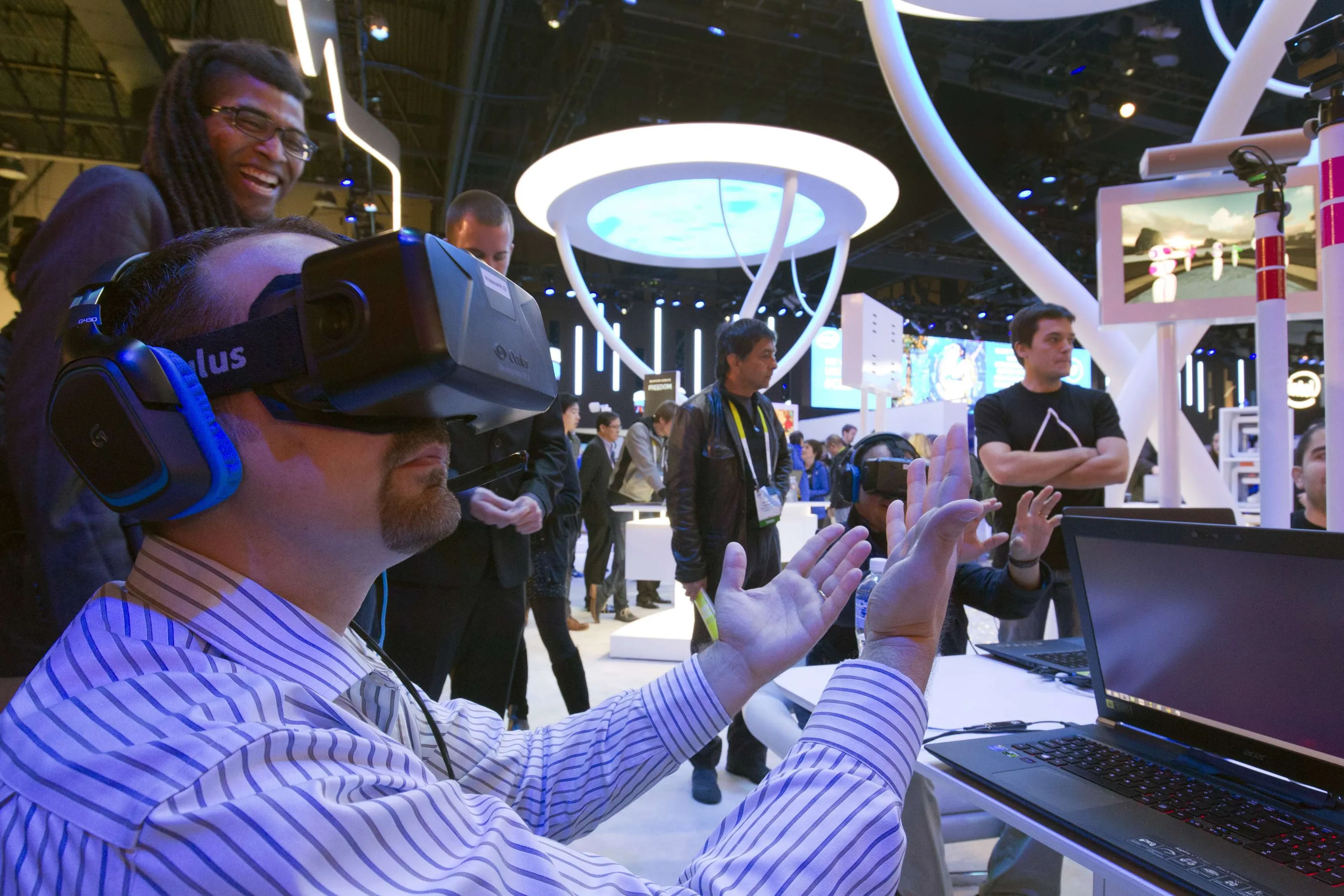An attendee wearing an Oculus Rift virtual reality headset plays in a virtual volleyball game at the Intel booth during the 2015 International Consumer Electronics Show (CES) in Las Vegas, Nevada January 6, 2015. The goggles give a full 3D immersion and 360 degree view, a representative said. (Photo by Steve Marcus/Reuters)`