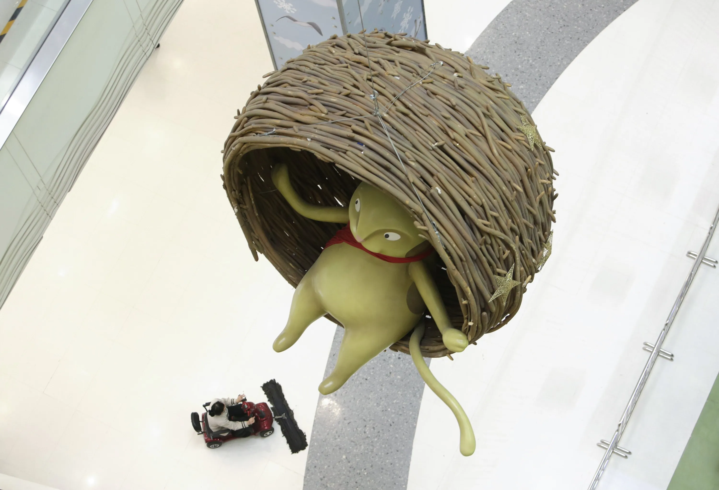 A decoration of a cat is pictured hanging above a cleaner working at the lobby of a shopping mall in Beijing, January 5, 2015. (Photo by Jason Lee/Reuters)