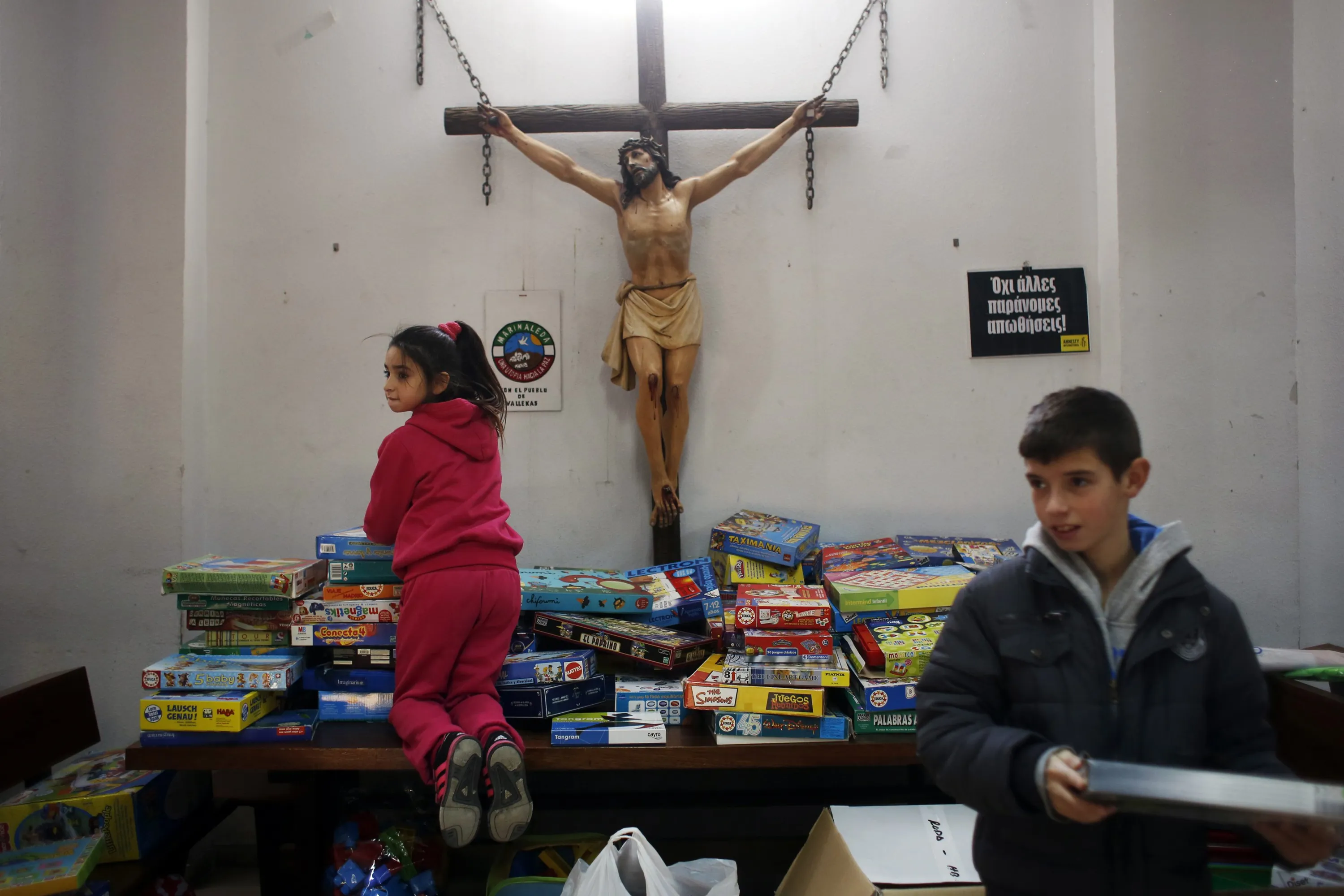 A girl reacts as she is asked not to step on the table as she chooses games during the distribution of donated toys to low income families at a church in Madrid January 5, 2015. Traditionally, children in Spain receive their presents delivered by the Three Wise Men on the morning of January 6 during the Christian holiday of the Epiphany. (Photo by Susana Vera/Reuters)