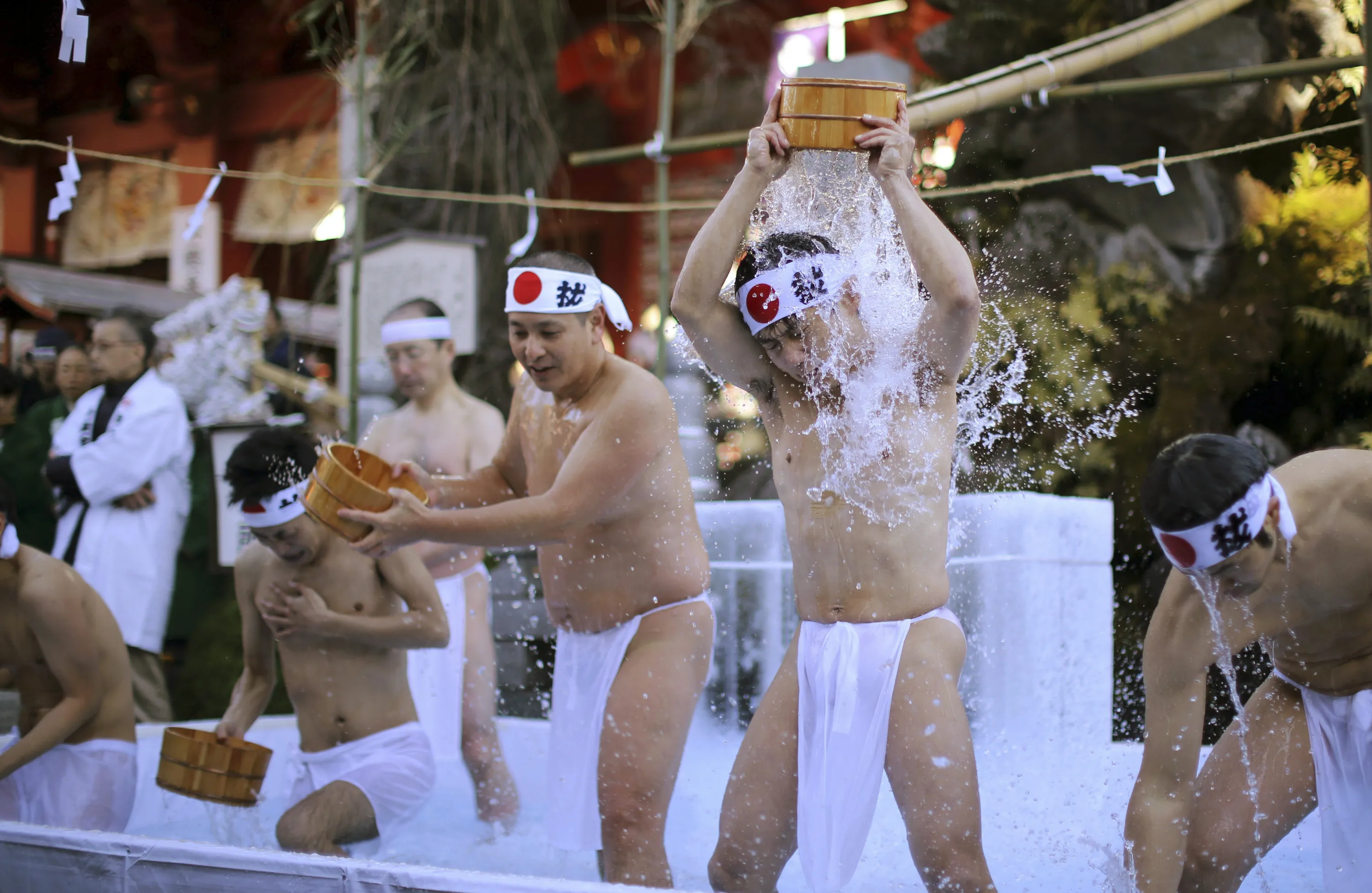 Half-naked shrine parishioners using a wooden tub pours cold water onto themselves during an annual cold-endurance festival at the Kanda Myojin Shinto shrine in Tokyo, Saturday, January 10, 2015. (Photo by Eugene Hoshiko/AP Photo)