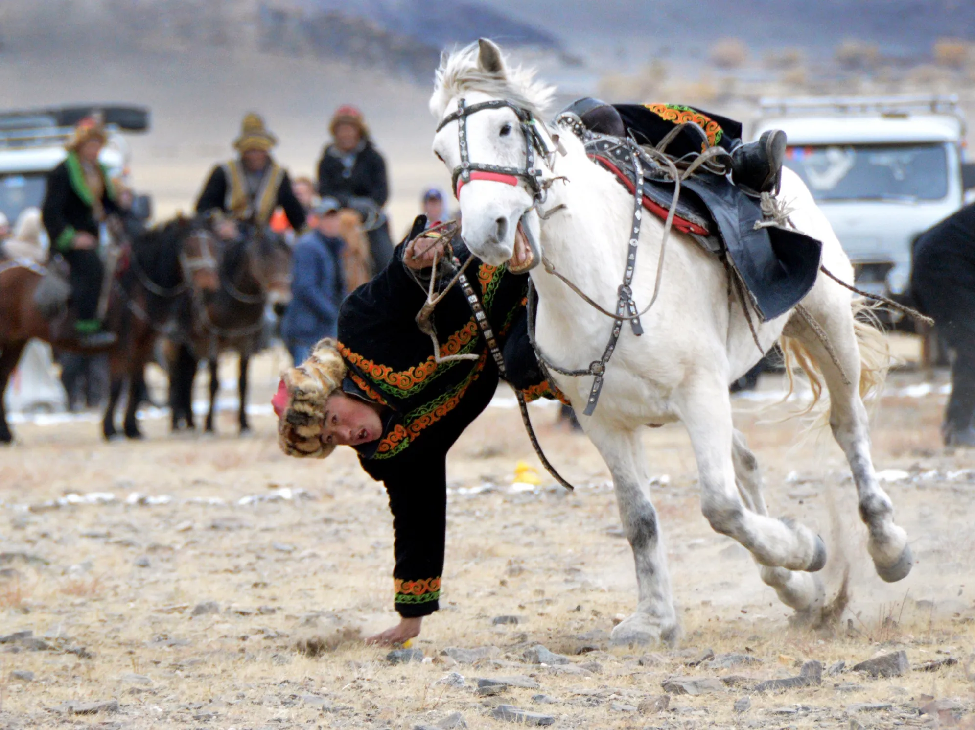 A participant picks up a coin from the ground in the games at the Eagle Hunting Festival. (Photo by Brad Ruoho/The Star Tribune)
