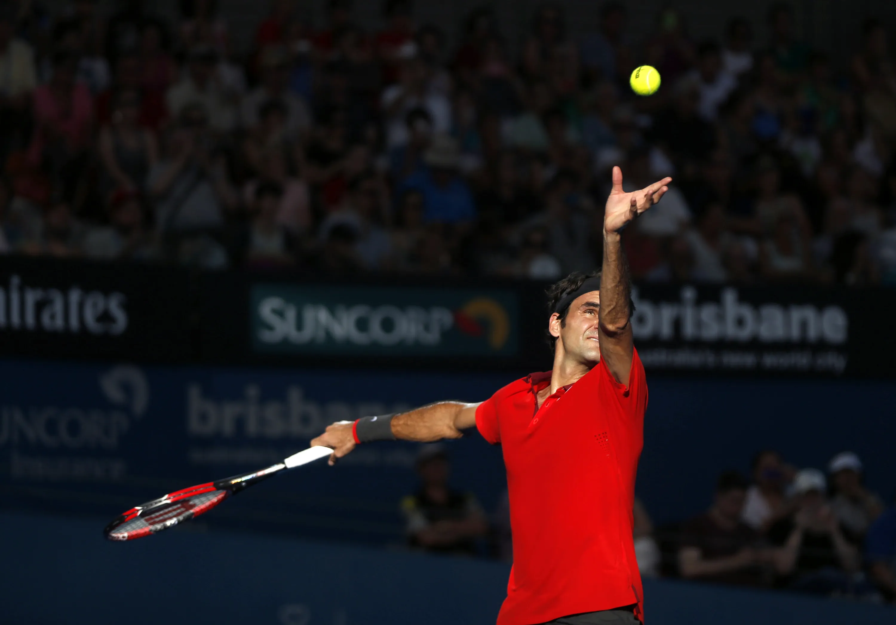 Roger Federer of Switzerland serves during his men's singles semi final win over Grigor Dimitrov of Bulgaria at the Brisbane International tennis tournament in Brisbane, January 10, 2015. (Photo by Jason Reed/Reuters)