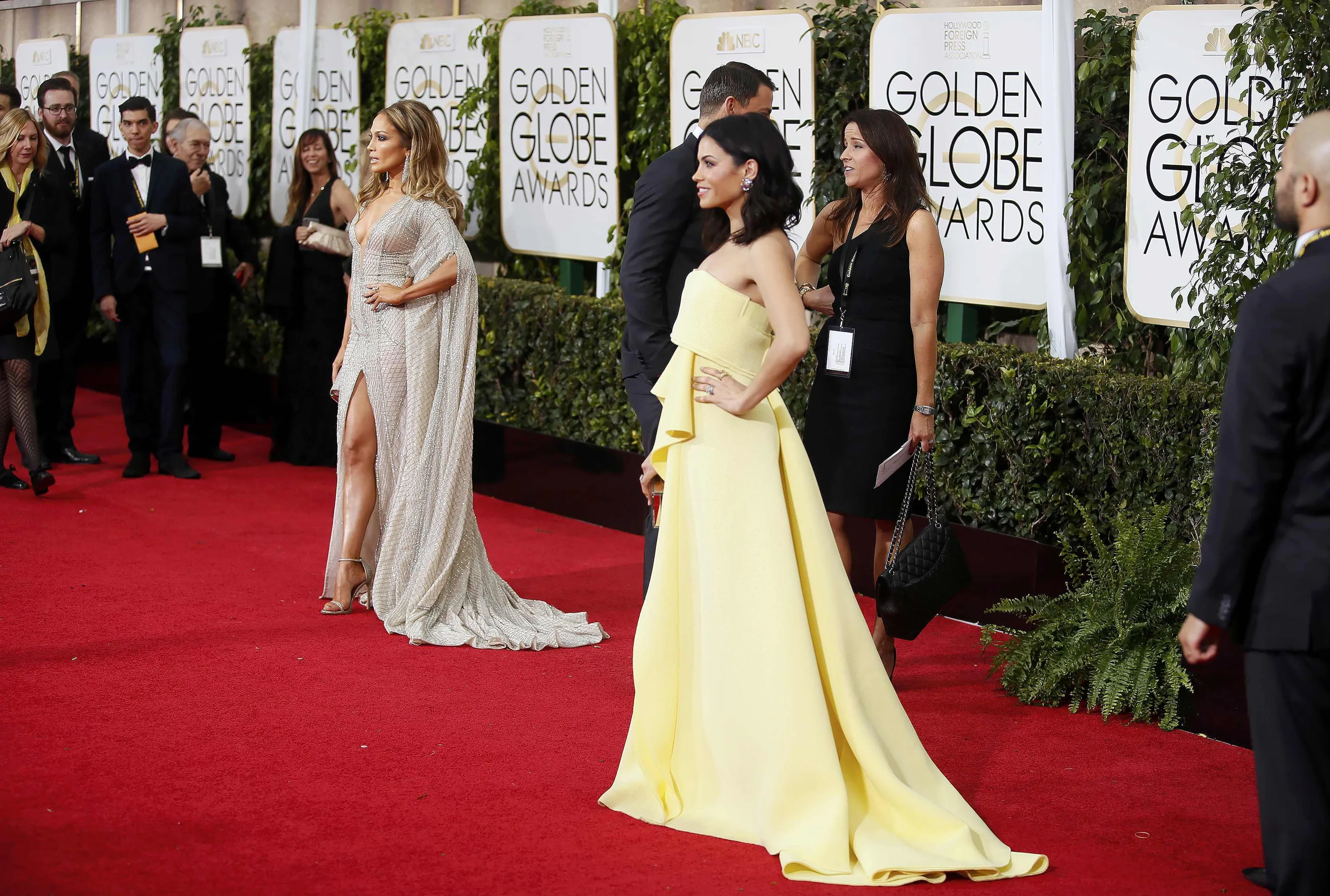 Actresses Jennifer Lopez (L) and Jenna Dewan-Tatum arrive at the 72nd Golden Globe Awards in Beverly Hills, California January 11, 2015. (Photo by Danny Moloshok/Reuters)