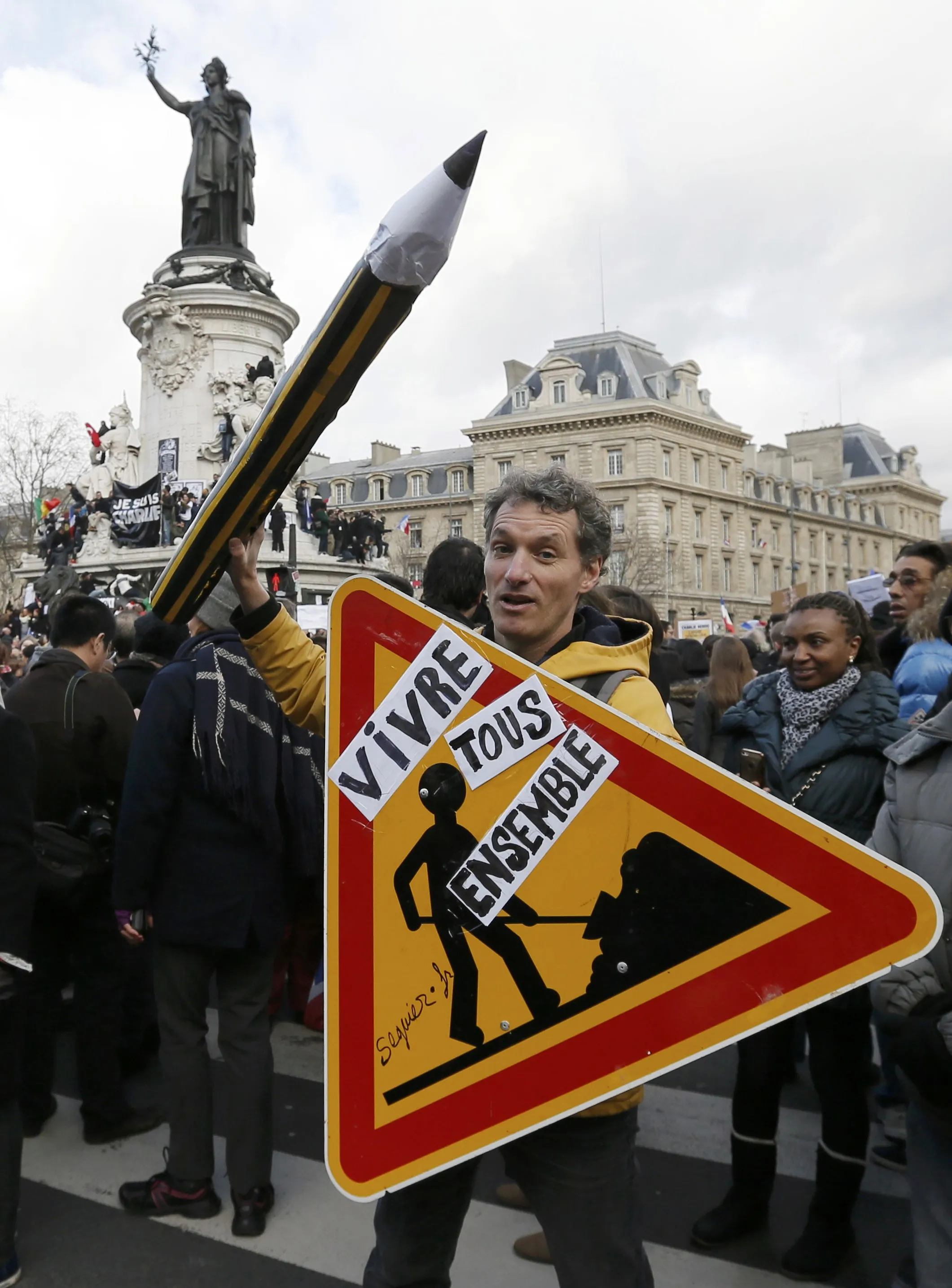 A Man carrying a rod sign reading “Live together” takes part in a Hundreds of thousands of French citizens solidarity march (Marche Republicaine) in the streets of Paris January 11, 2015. (Photo by Gonzalo Fuentes/Reuters)