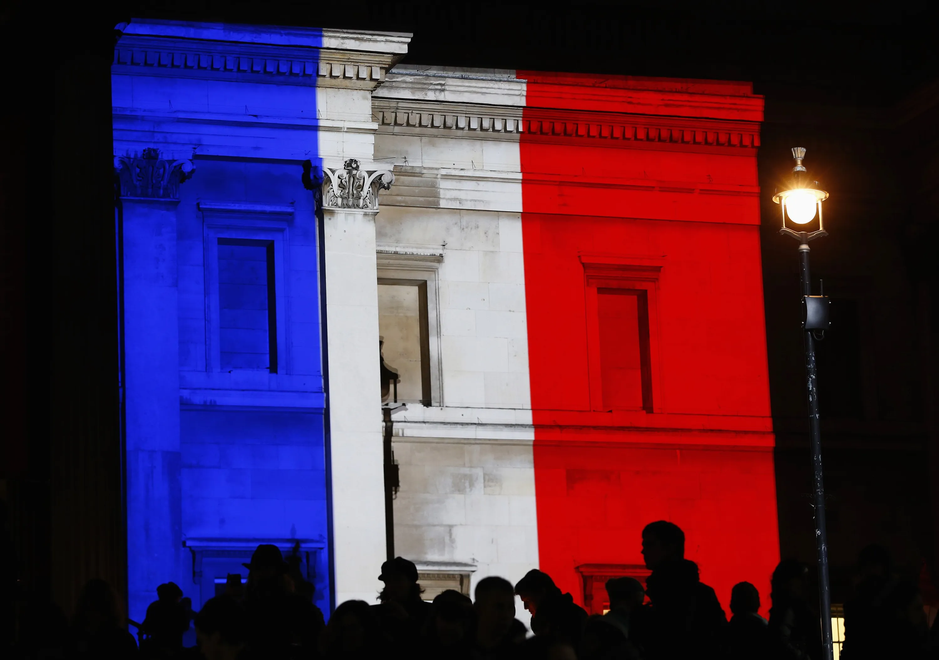 The colours of the French national flag are projected in tribute to the victims of the Paris terror attacks, onto The National Gallery in London January 11, 2015. (Photo by Eddie Keogh/Reuters)