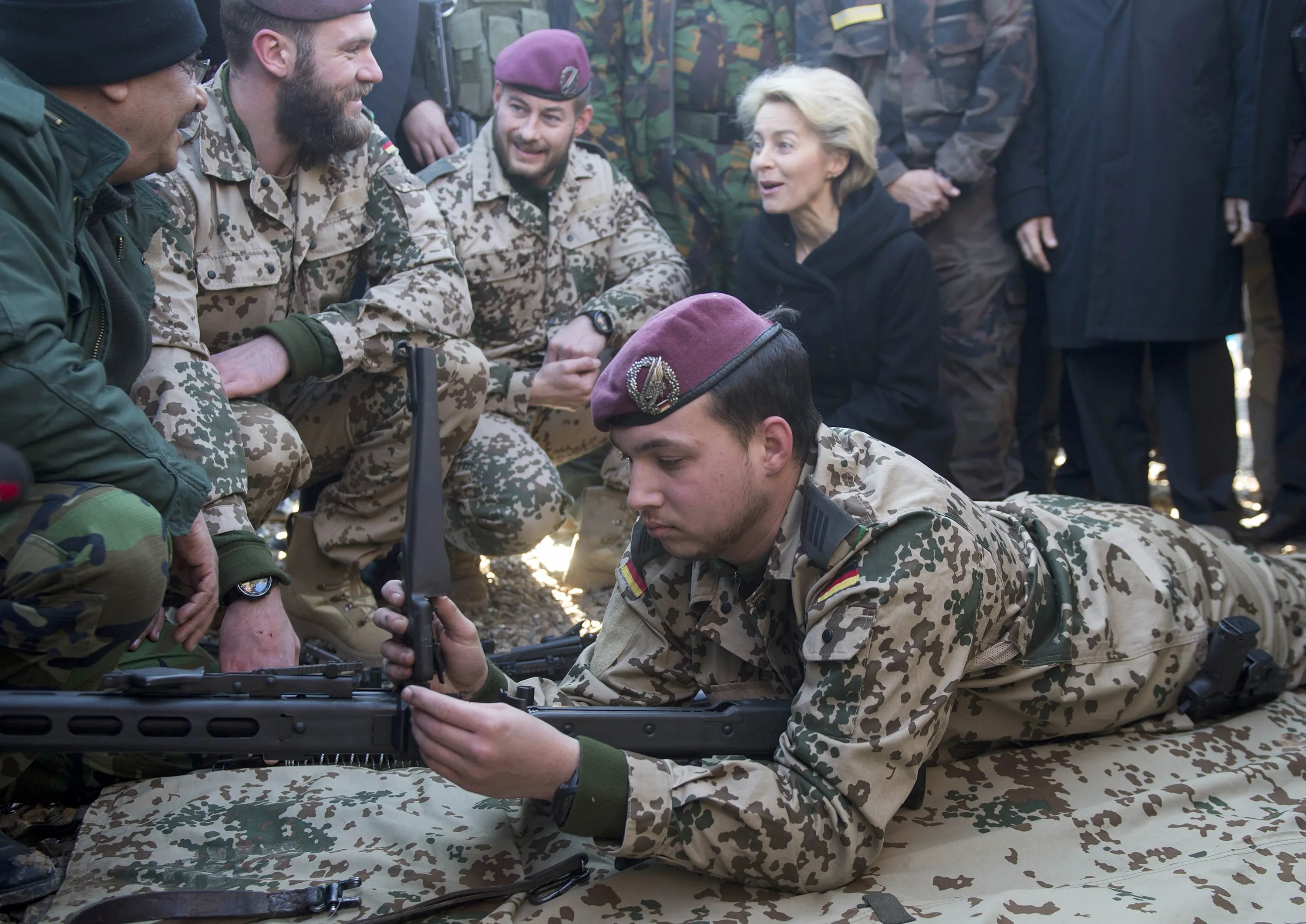 German Defence Minister Ursula von der Leyen (background R) visits the Zeravani Training Centre in Bnaslava near Arbil, north of Iraq January 12, 2015, where Kurdish forces are being trained by the German army, Bundeswehr. (Photo by Maurizio Gambarini/Reuters)