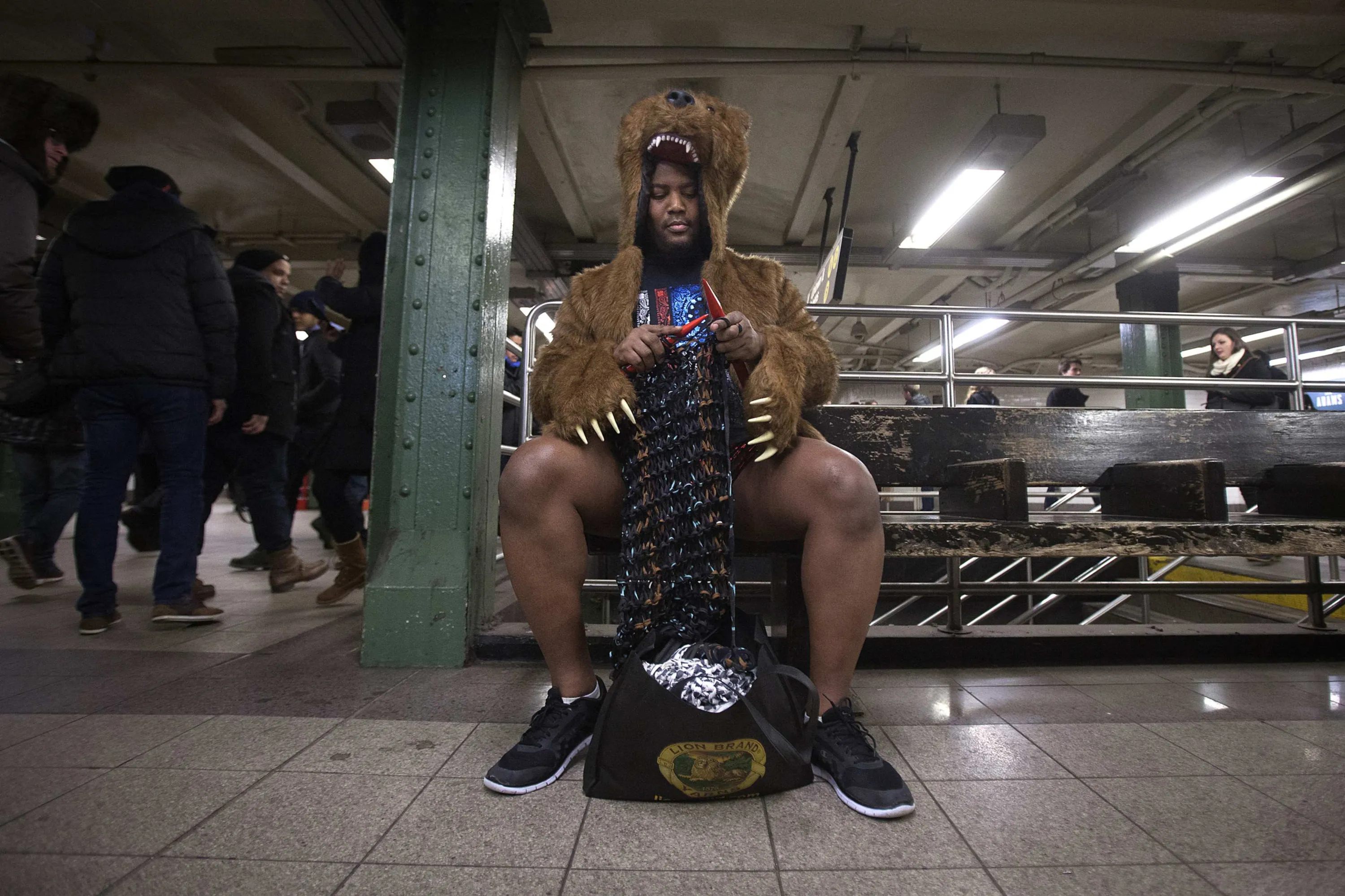 A man, wearing a bear costume, knits as he takes part in the “No Pants Subway Ride” in the Manhattan borough of New York January 11, 2015. (Photo by Carlo Allegri/Reuters)