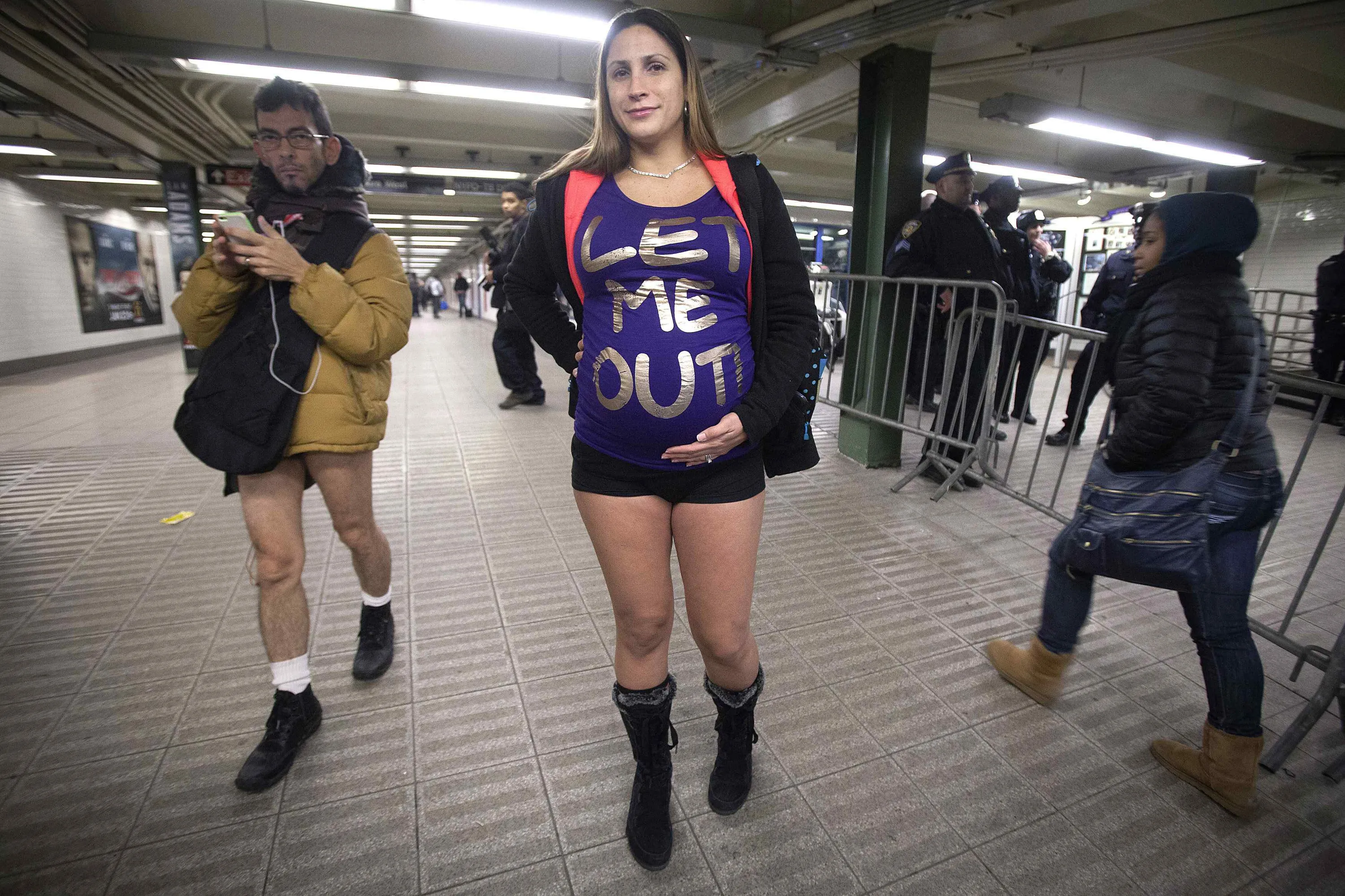 A pregnant woman takes part in the “No Pants Subway Ride” in the Manhattan borough of New York January 11, 2015. (Photo by Carlo Allegri/Reuters)