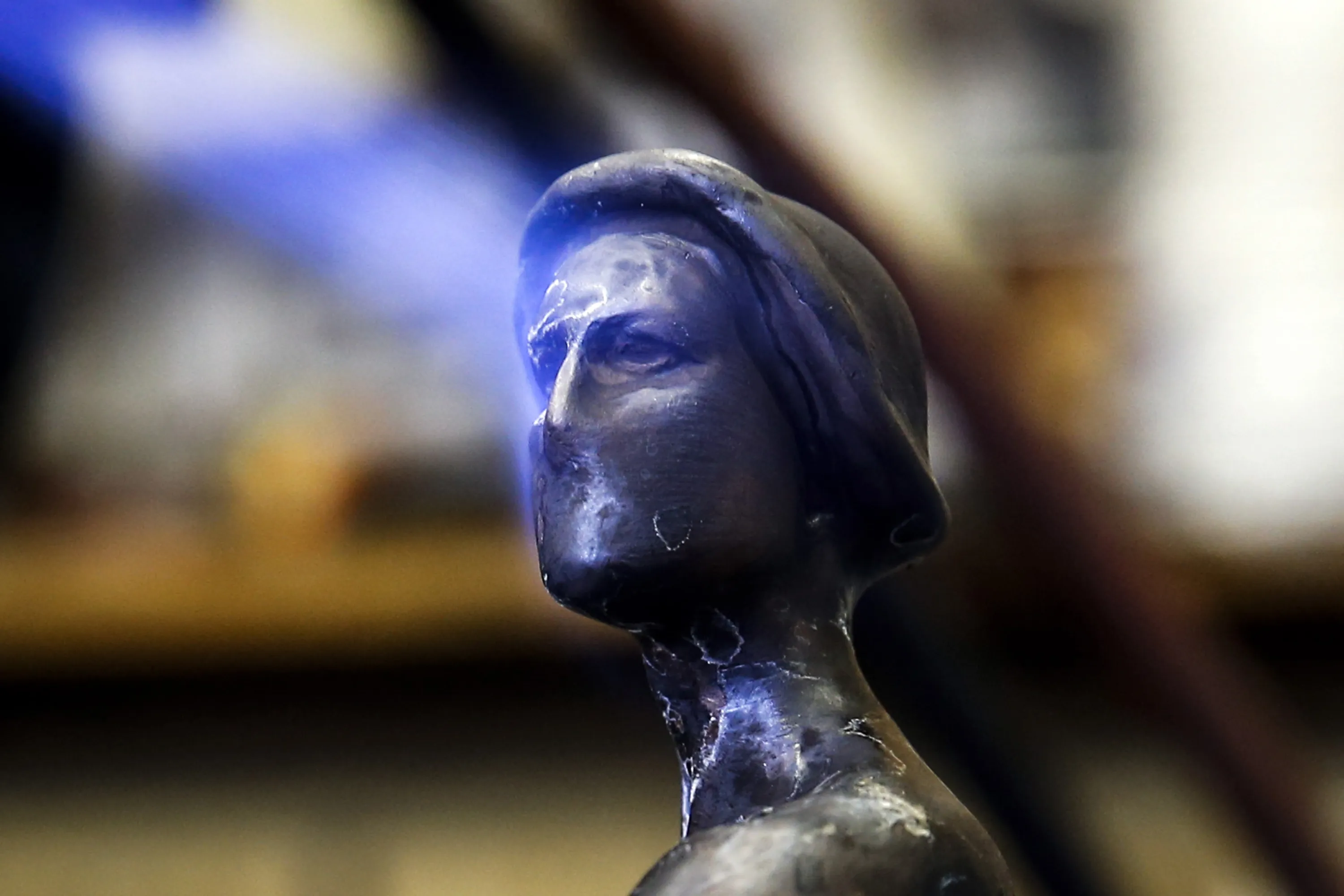 The face of “The Actor” statuette is heated with a torch as Patina artist Joaquin Quintero applies a formula of salts and acids on the bronze metal in order to create the patina coloring during a media event on the production of statuettes for the 21th annual Screen Actors Guild (SAG) Awards at American Fine Arts Foundry in Burbank, California January 13, 2015. (Photo by Patrick T. Fallon/Reuters)