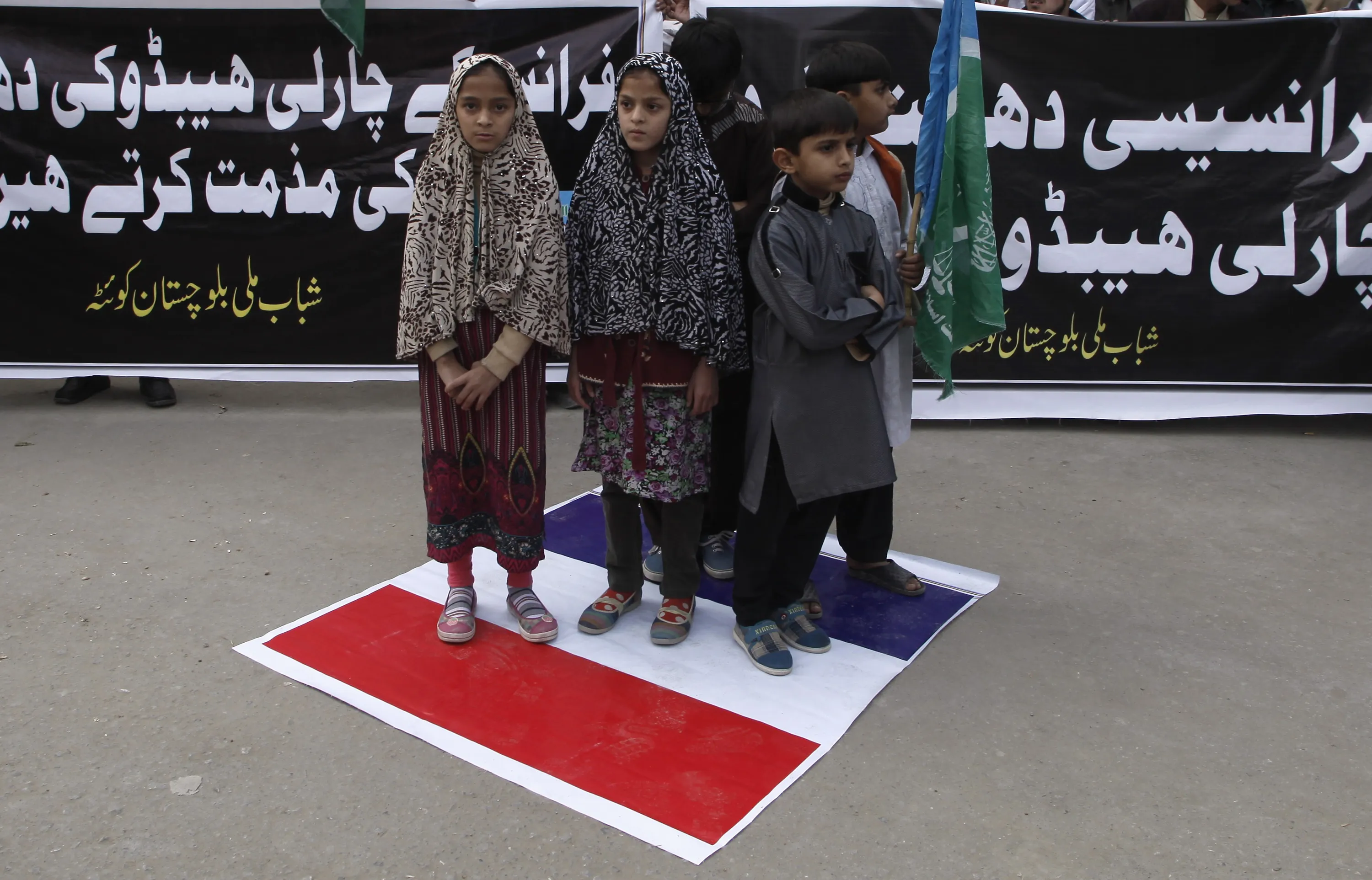 Supporters of Shabab-e-Milli, the youth wing of the Jamaat-e-Islami party, stand on a top of a replica of the French flag to protest against satirical French weekly newspaper Charlie Hebdo, in Quetta January 16, 2015. (Photo by Naseer Ahmed/Reuters)