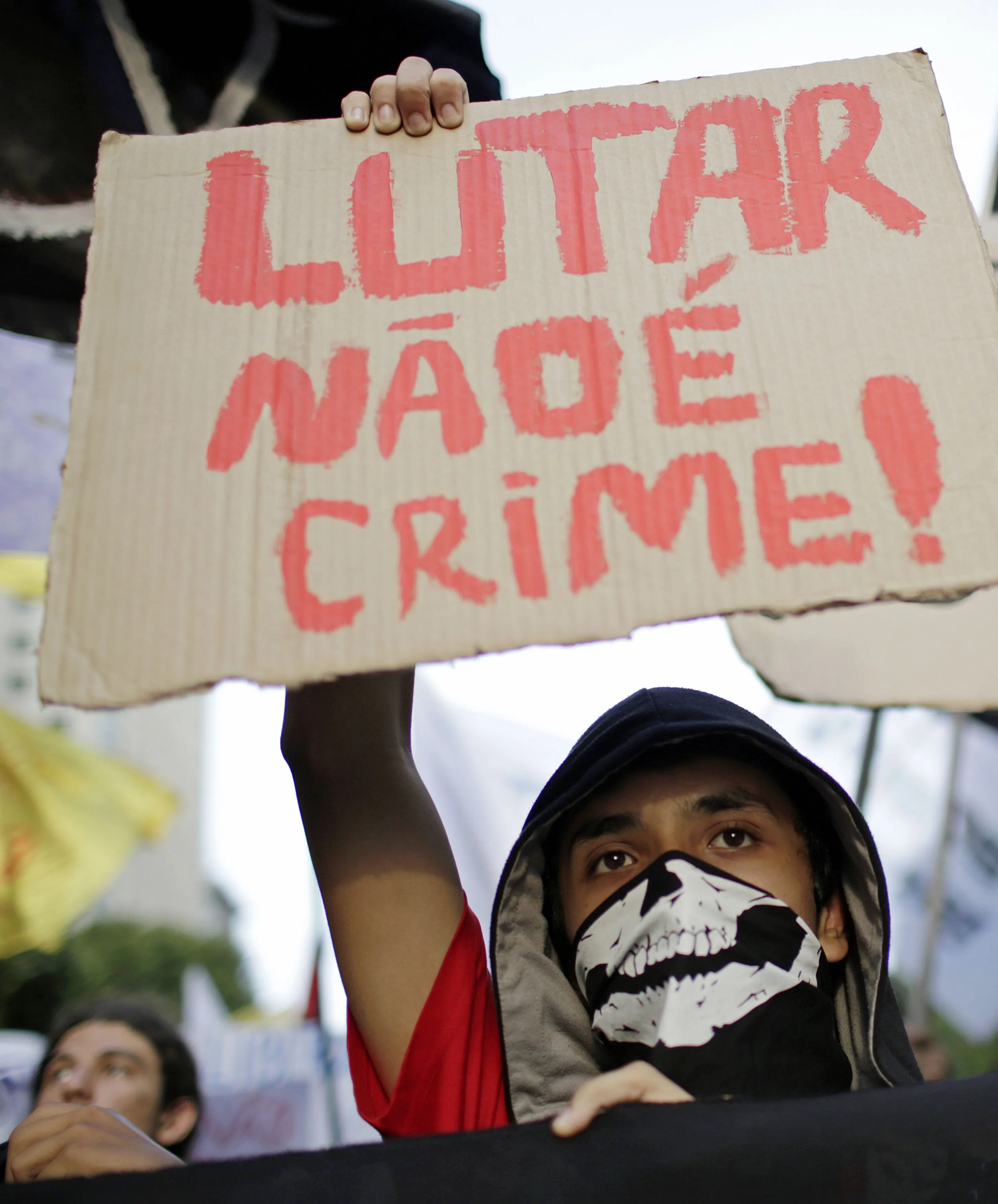 A demonstrator holds a sign thats reads, “Fighting is not a crime!” during a protest against fare hikes for city buses in Rio de Janeiro January 16, 2015. (Photo by Mauro Pimentel/Reuters)