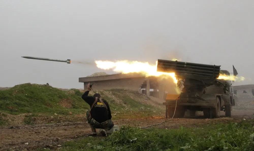 Al-Furqan brigade fighters, part of the Free Syrian Army, launch a Grad rocket towards forces loyal to Syria's president Bashar Al-Assad located in Mork town, Hama countryside, from Khan Sheikoun, Idlib countryside January 17, 2015. REUTERS/Mohamad Bayoush (SYRIA - Tags: POLITICS CIVIL UNREST CONFLICT )