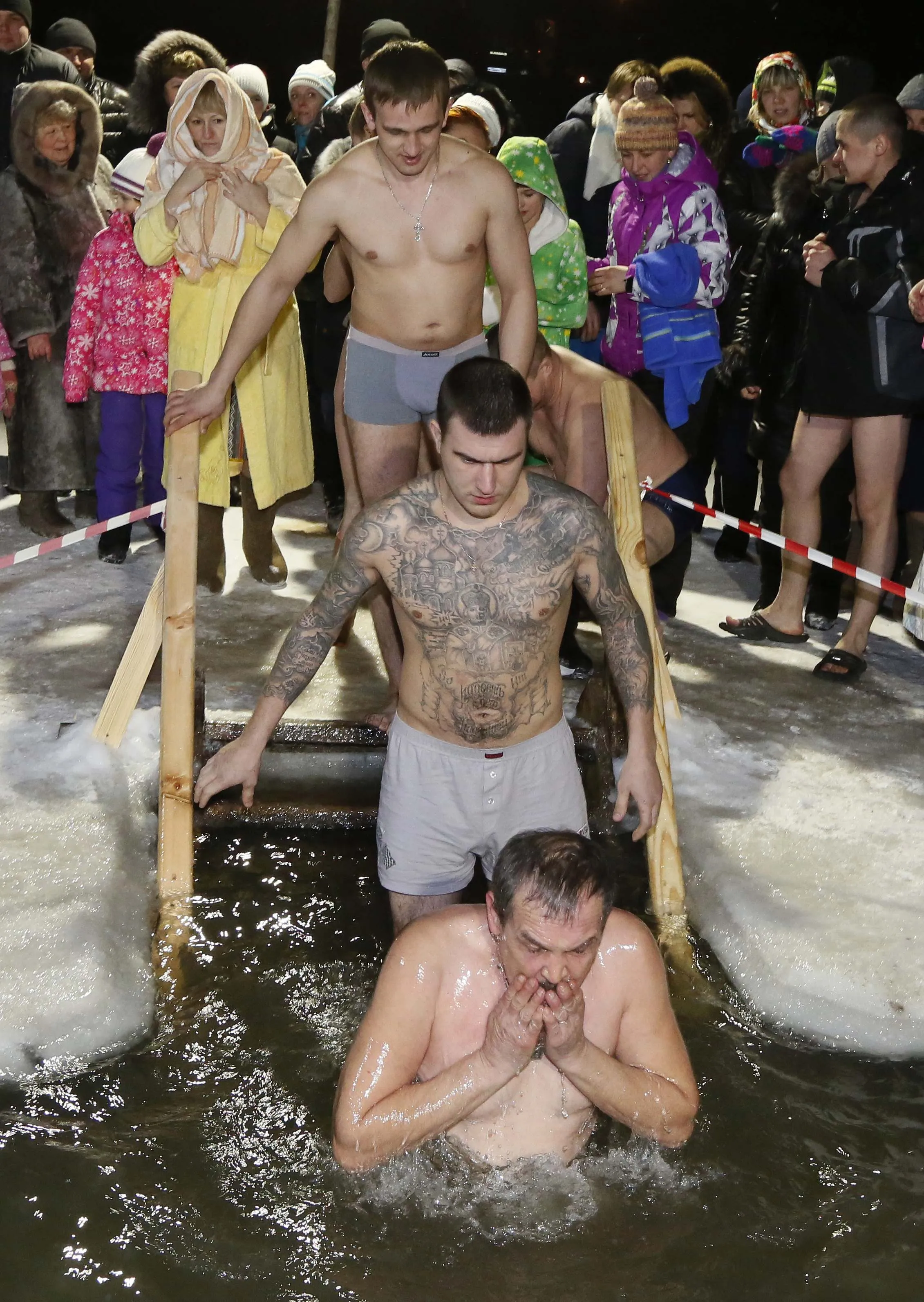 People immerse themselves in an ice hole in the Chulym river, with the air temperature at about minus 12 degrees Celsius (10.4 degrees Fahrenheit), during celebrations for the Russian Orthodox Epiphany outside of the town of Nazarovo, Krasnoyarsk region January 19, 2015. (Photo by Ilya Naymushin/Reuters)