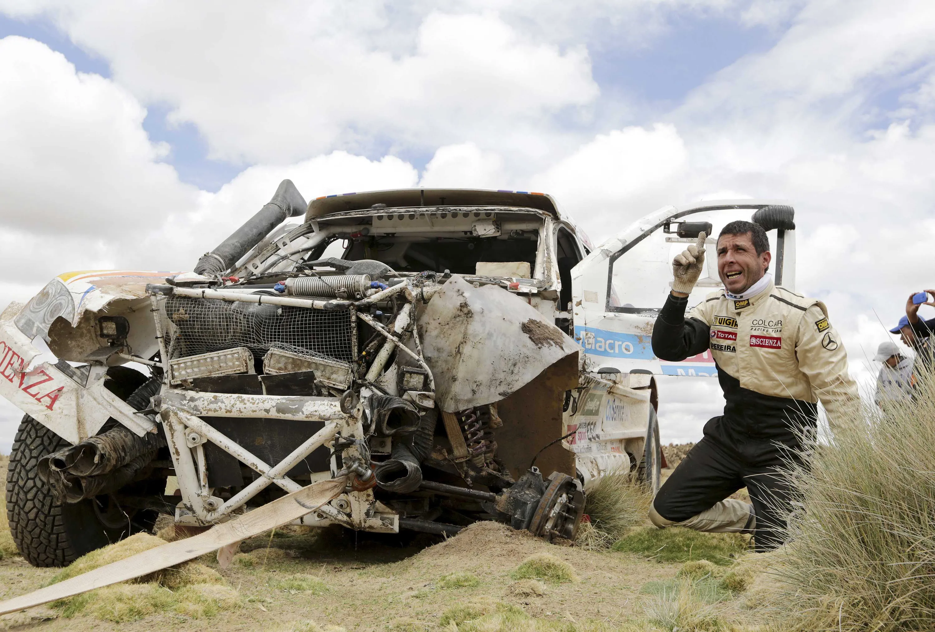 Mercedes driver Juan Manuel Silva of Argentina is seen next to their wrecked car during the 7th stage of the Dakar Rally from Iquique to Uyuni January 10, 2015. (Photo by Daniel Rodrigo/Reuters)
