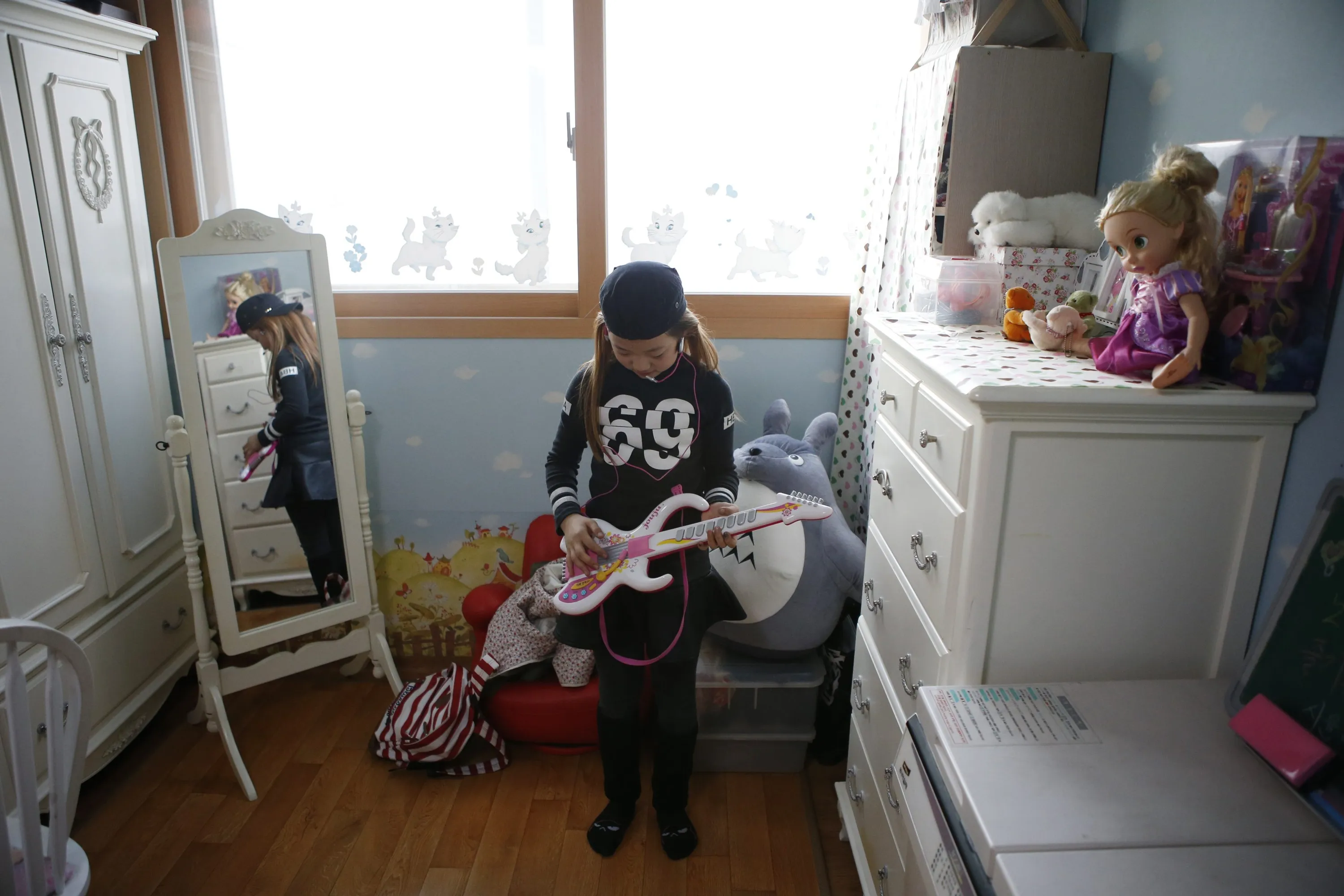 Kim Si-yoon plays a toy guitar at her house in Seoul November 20, 2014. (Photo by Kim Hong-Ji/Reuters)