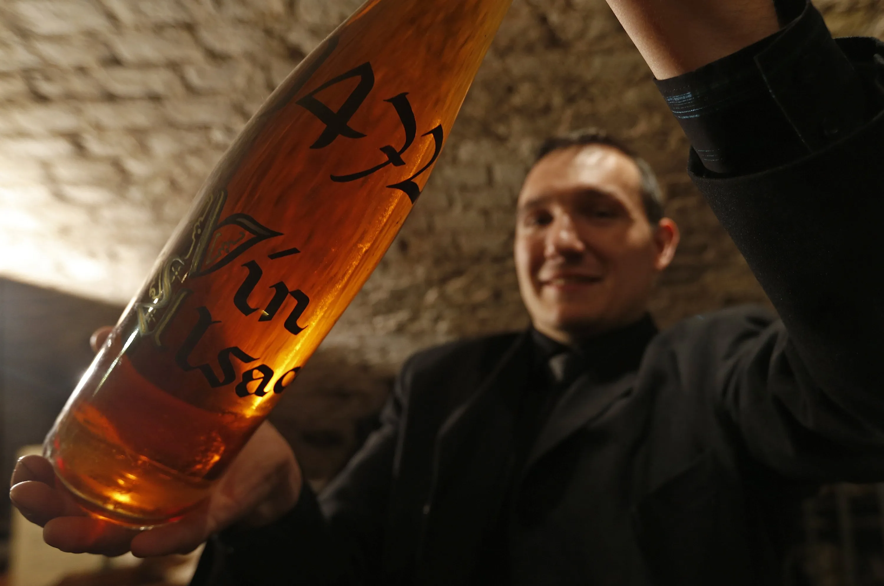 Thibaut Baldinger, manager of the wine cellar at the Strasbourg Hospital shows a bottle containing wine dating from 1472 at their cellar in Strasbourg, January 21, 2015. Known as the oldest wine in the world stored in a barrel, the wine will be transferred on Wednesday into a new barrel after the one it had been stored in since around 1715 showed leaks. (Photo by Vincent Kessler/Reuters)