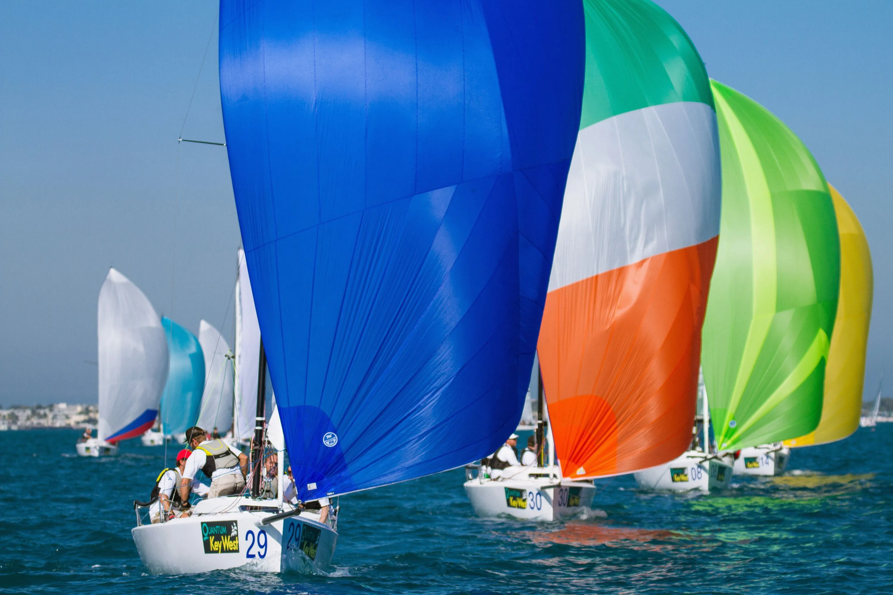 J/70s sailboats navigate under spinnakers during the third day of racing at the Quantum Key West regatta off Key West, Florida January 21, 2015. With 54 entries, the J/70 class is the largest of the 10-class fleet that has attracted 115 sailing vessels to the Florida Keys. The five-day regatta is to continue through Friday, January 23, 2015. (Photo by Ken Stanek/Reuters/Florida Keys News Bureau)