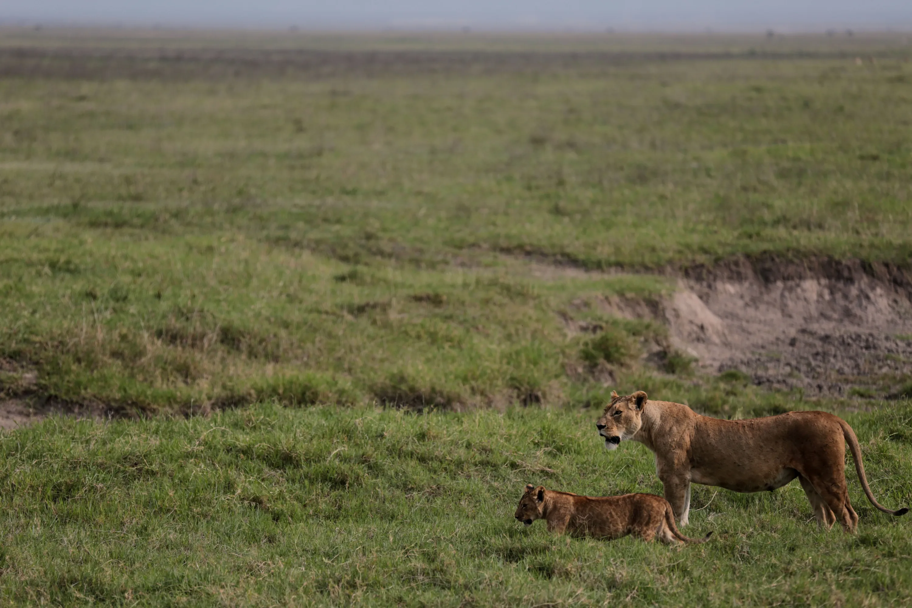 Lions walk in the Ngorongoro Crater in Ngorongoro Conservation Area, west of Arusha, northern Tanzania, Monday, January 19, 2015. According to Tanzanian officials, the crater was formed as a result of a volcanic eruption and collapse three millions years ago and is now one of the most densely crowded African wildlife areas in the world. (Photo by Mosa'ab Elshamy/AP Photo)