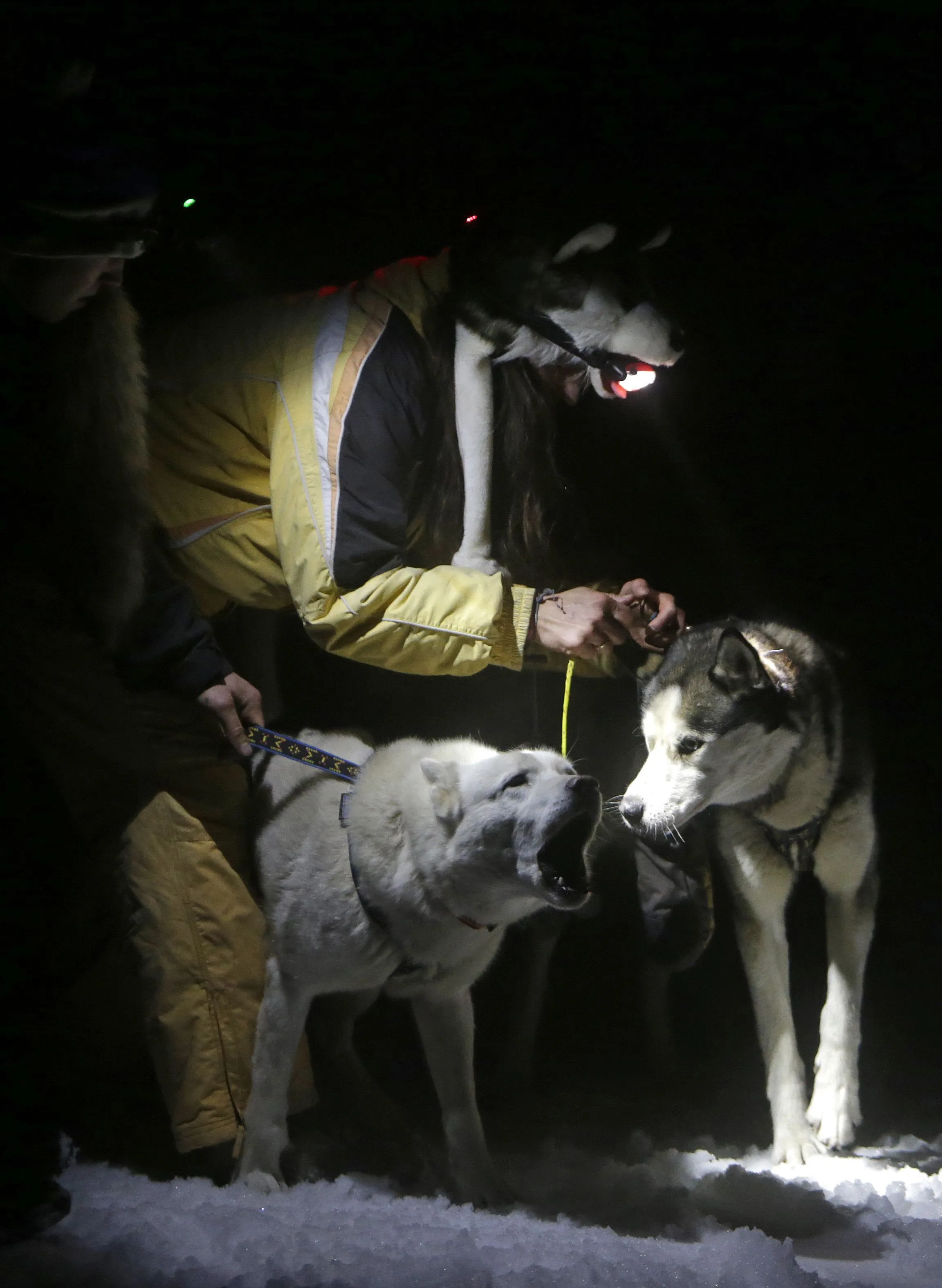 A musher takes care of his dogs during a break in a stage of the Sedivackuv Long dog sled race in Destne v Orlickych horach, January 22, 2015. (Photo by David W. Cerny/Reuters)