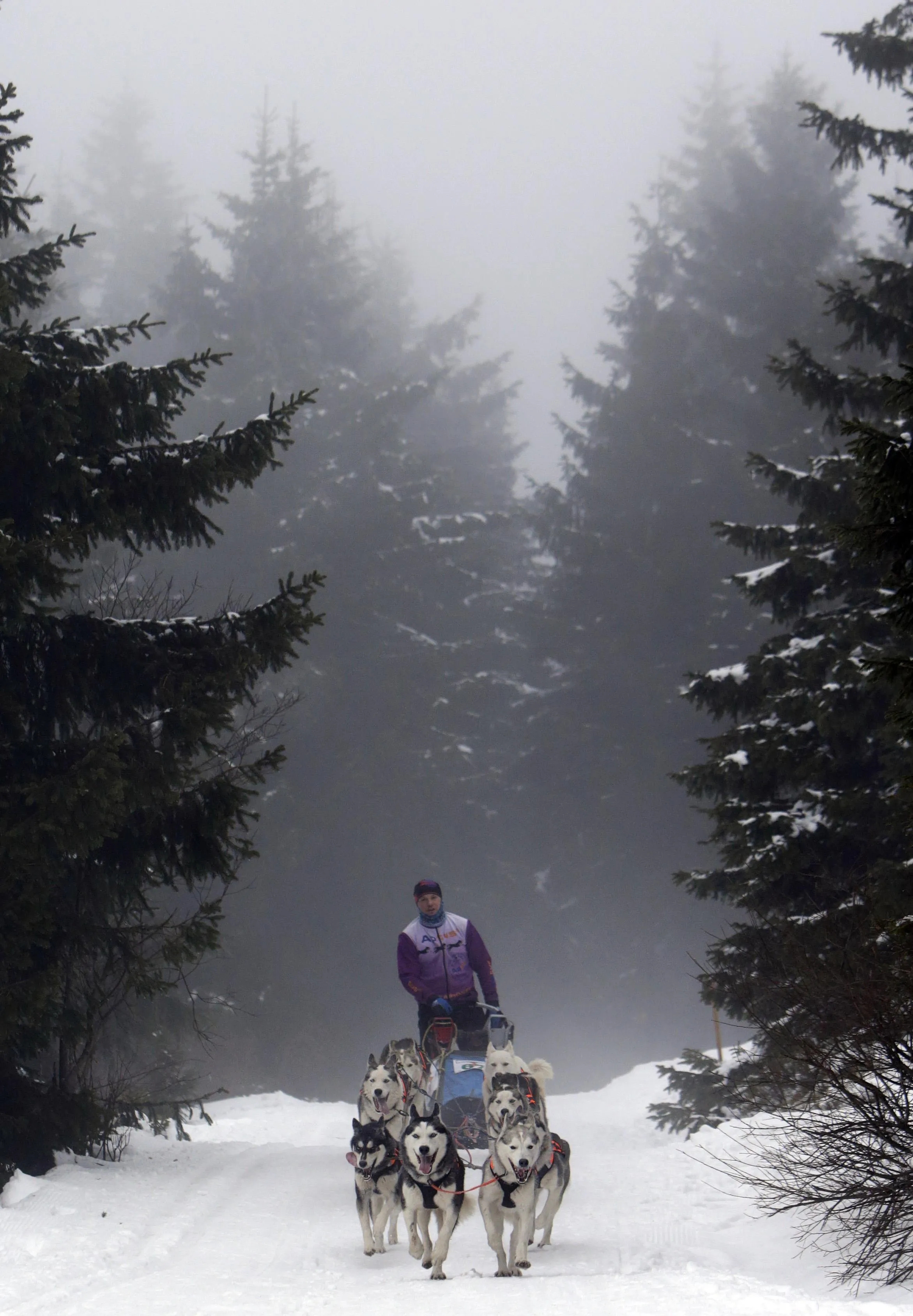 A musher rides his dog sled during a stage of the Sedivackuv Long dog sled race in Destne v Orlickych horach January 23, 2015. (Photo by David W. Cerny/Reuters)