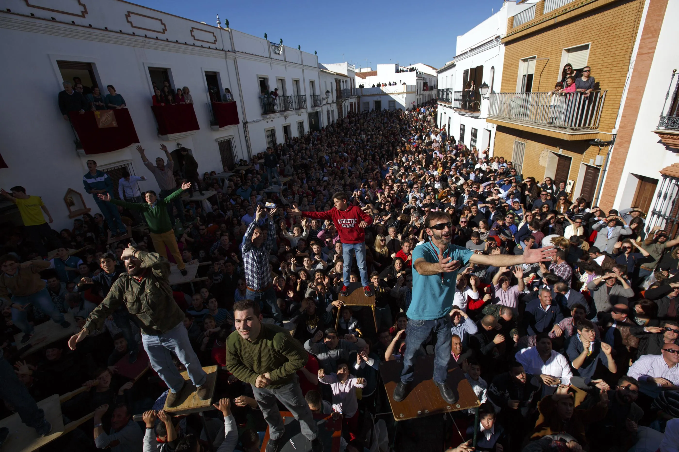 People shout to ask for food thrown from a balcony during the annual San Antonio Abad (Saint Anton Abbott) festival in Trigueros, southwest Spain January 25, 2015. (Photo by Marcelo del Pozo/Reuters)