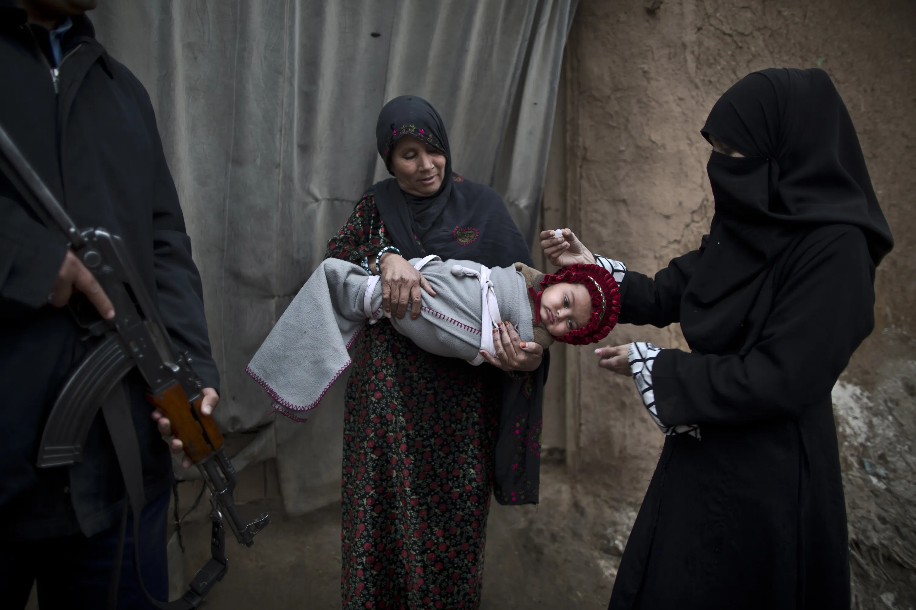 A Pakistani police officer, left, stands guard while a polio worker vaccinates an Afghan refugee child against polio in a slum on the outskirts of Islamabad, Pakistan, Wednesday, January 21, 2015. Militants have spread a rumor among ultraconservative parents in Pakistan's deeply religious northwest, saying the polio vaccine will make their children impotent. The vaccine, they claim, is a ploy by the West to limit the world's Muslim population. (Photo by Muhammed Muheisen/AP Photo)