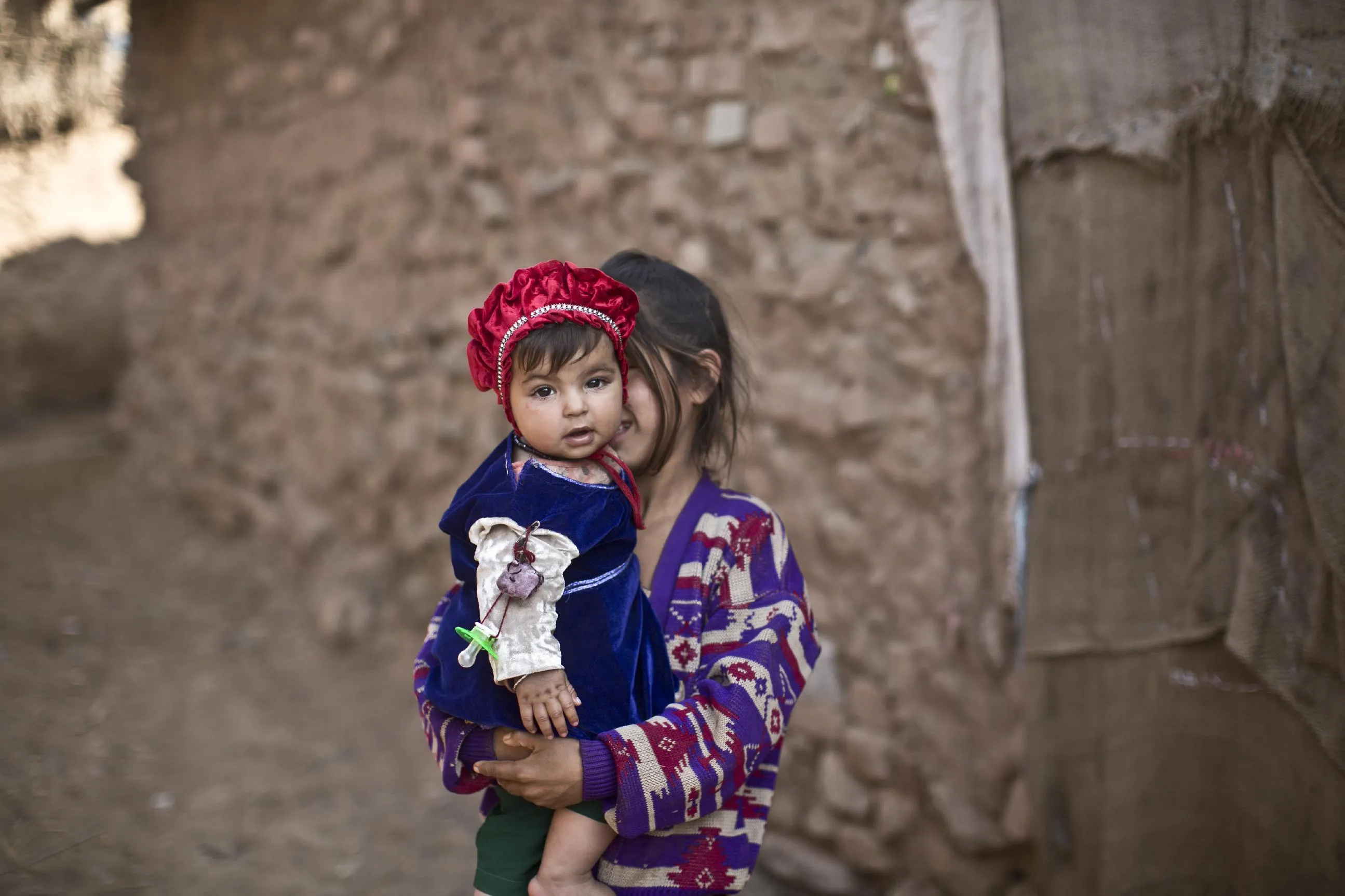 An Afghan refugee girl holds her younger sister in a slum on the outskirts of Islamabad, Pakistan, Sunday, January 18, 2015. (Photo by Muhammed Muheisen/AP Photo)