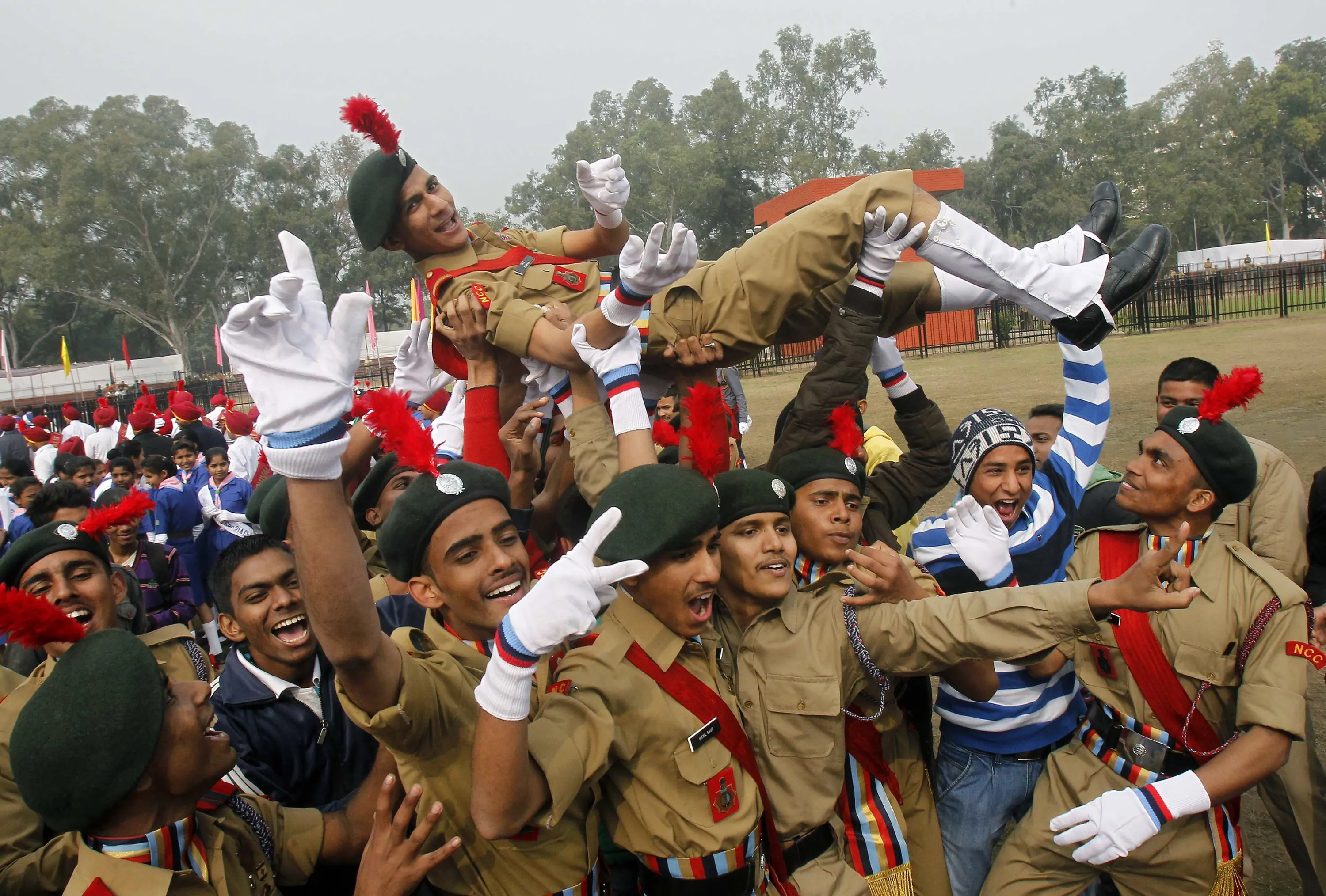 Cadets from the National Cadet Corps (NCC) celebrate after being awarded third position in the best marching trophy competition during the Republic Day celebrations in the northern Indian city of Chandigarh January 26, 2015. (Photo by Ajay Verma/Reuters)