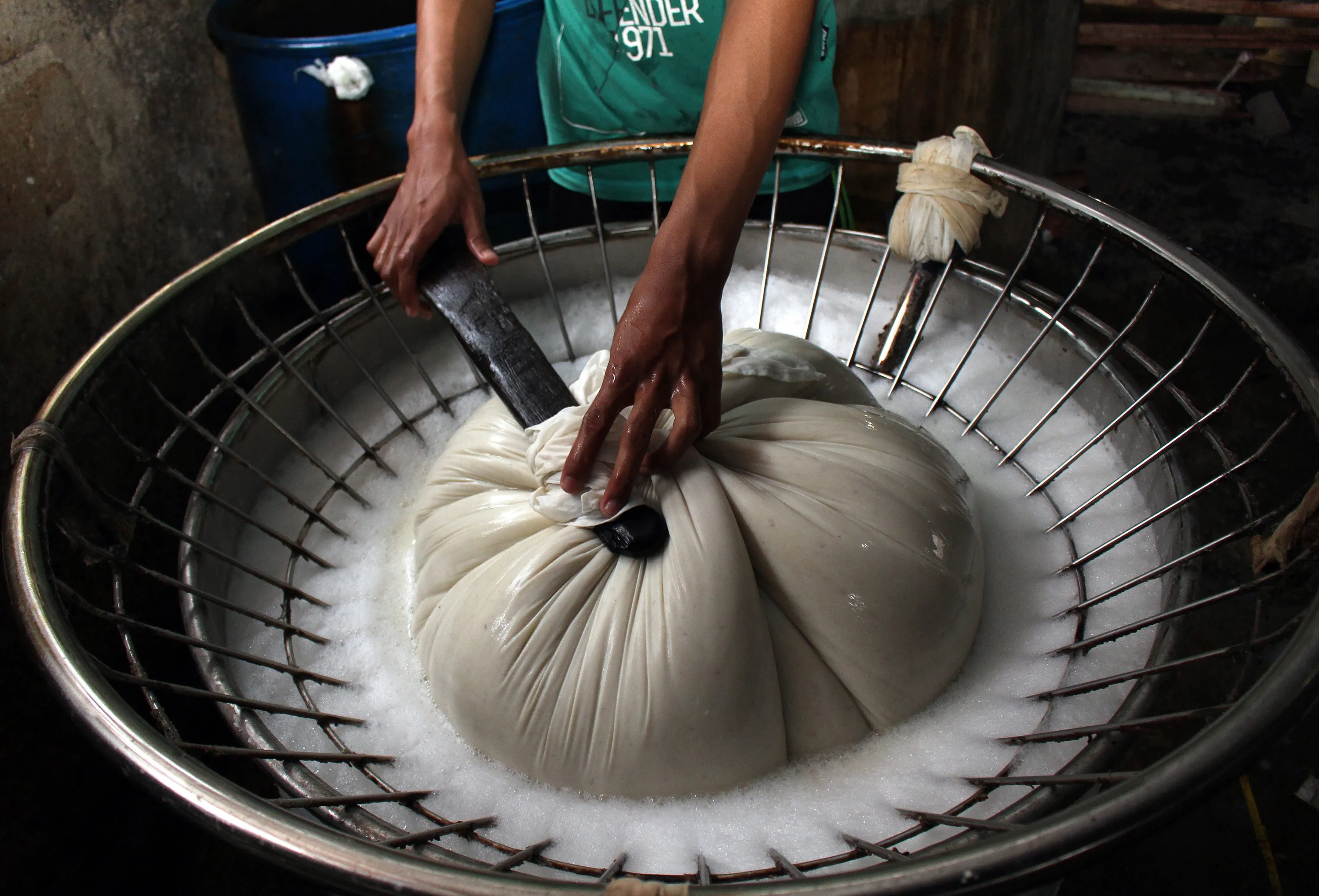 A worker filtrates hot boiled soybean porridge using a soft cloth in a traditional tofu factory in Depok, Indonesia, 21 January 2015. (Photo by Adi Weda/EPA)