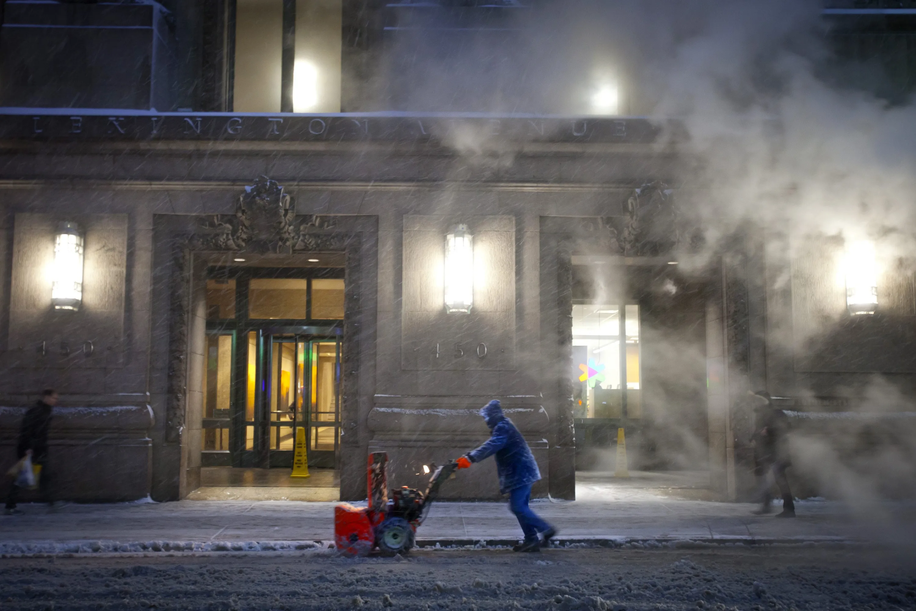 A worker pushes a snow blower down Lexington Avenue near Grand Central Terminal as it snows in the Manhattan borough of New York January 26, 2015. (Photo by Carlo Allegri/Reuters)