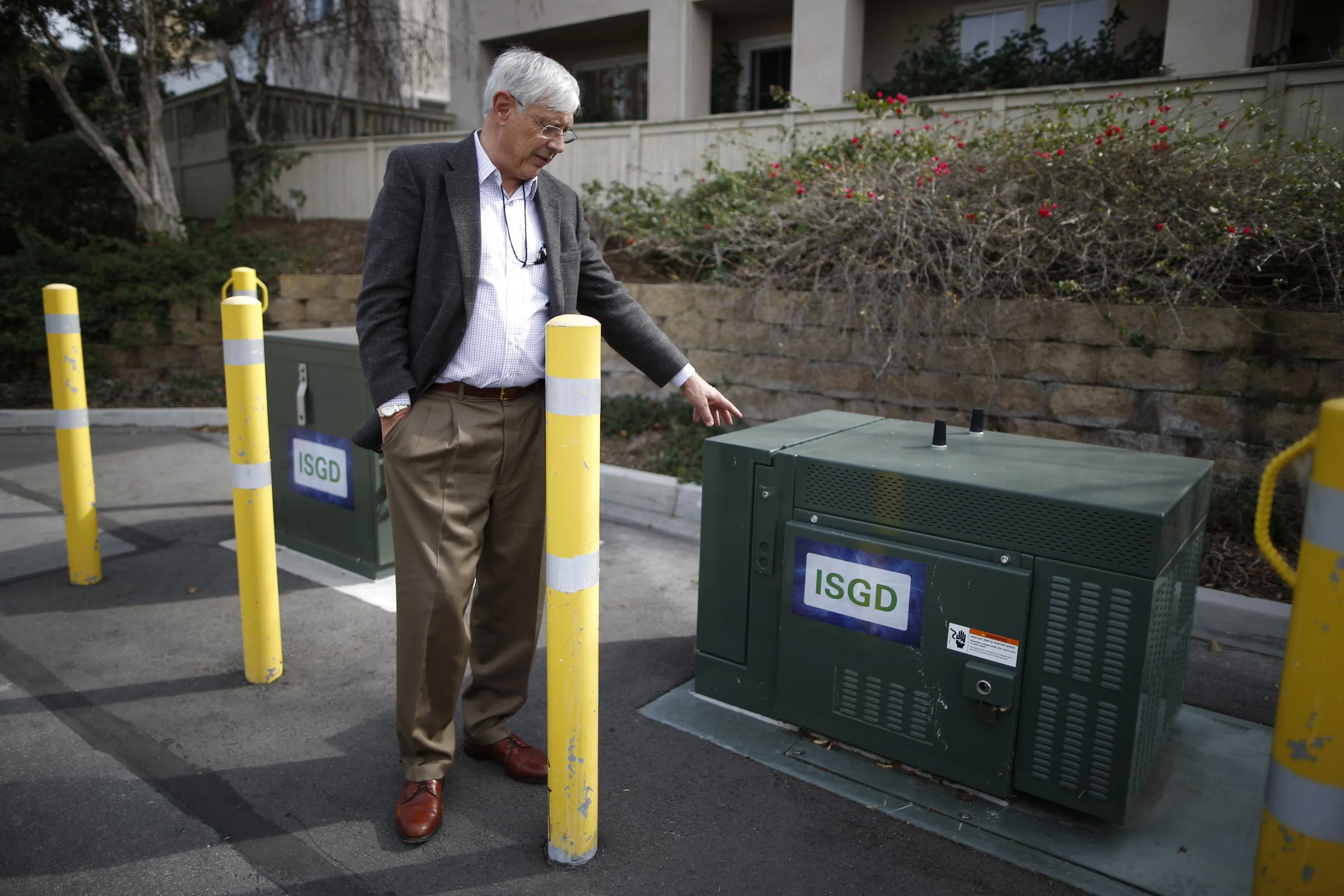 Jerry Thode, sub project manager of the Irvine Smart Grid Demonstration project, points out a community energy storage box in Irvine, California January 26, 2015. (Photo by Lucy Nicholson/Reuters)