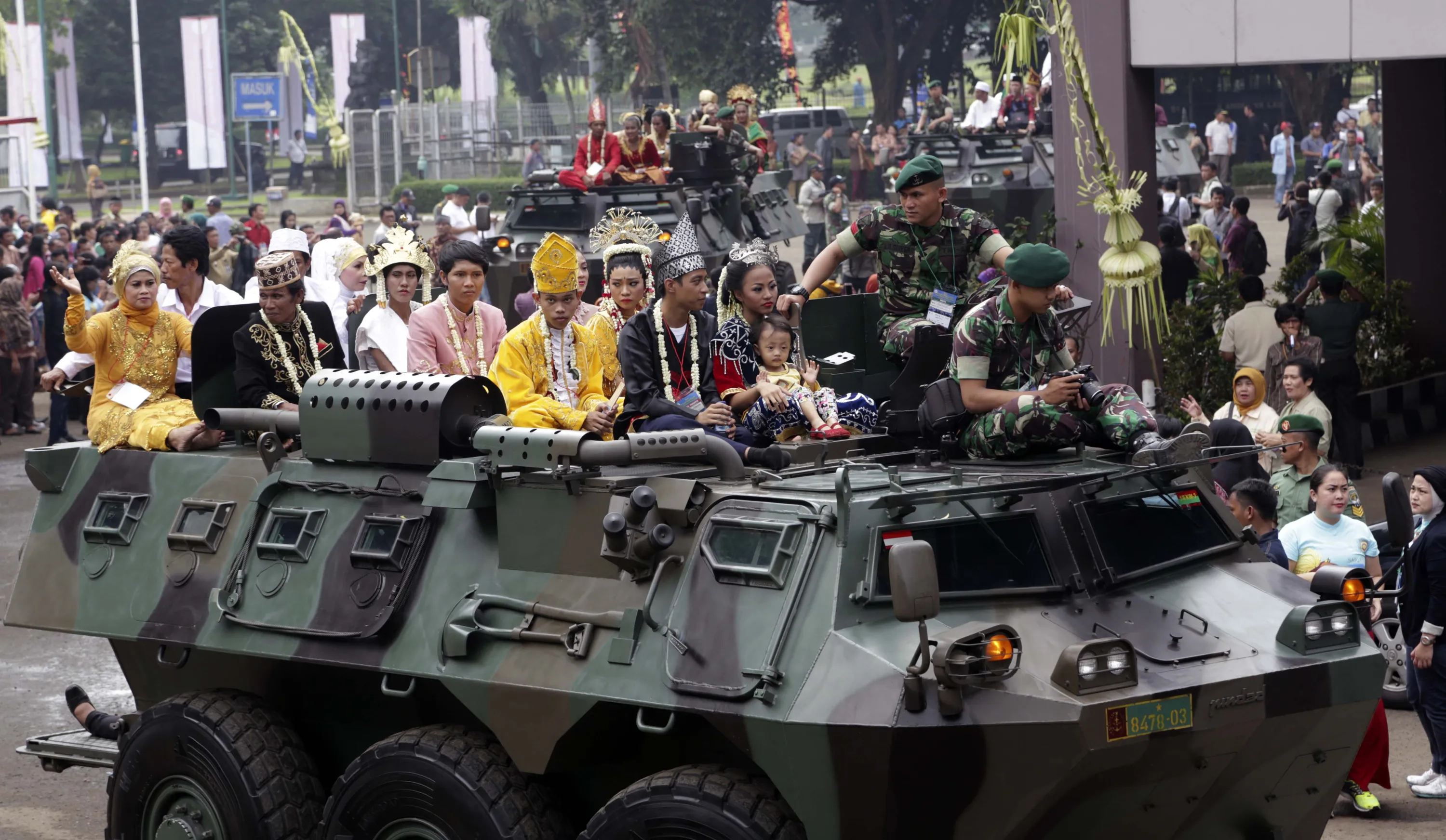 Brides and grooms sit on top of an Indonesian Army vehicle during a mass wedding ceremony organized in Jakarta, Indonesia, Wednesday, January 28, 2015. (Photo by Achmad Ibrahim/AP Photo)