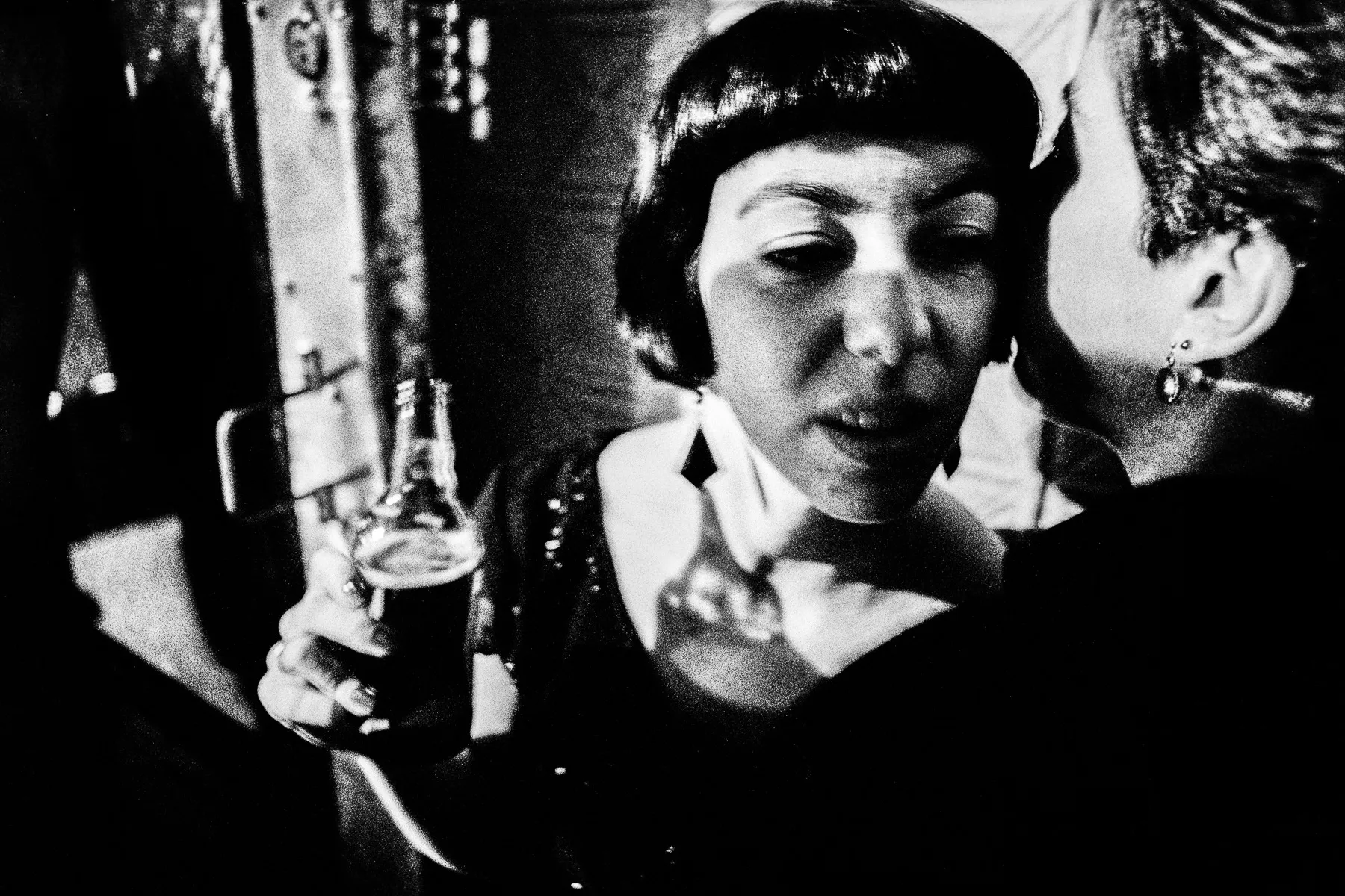 Kim whispers into Valerie's ear, 1986. (Photo by Ken Schles)