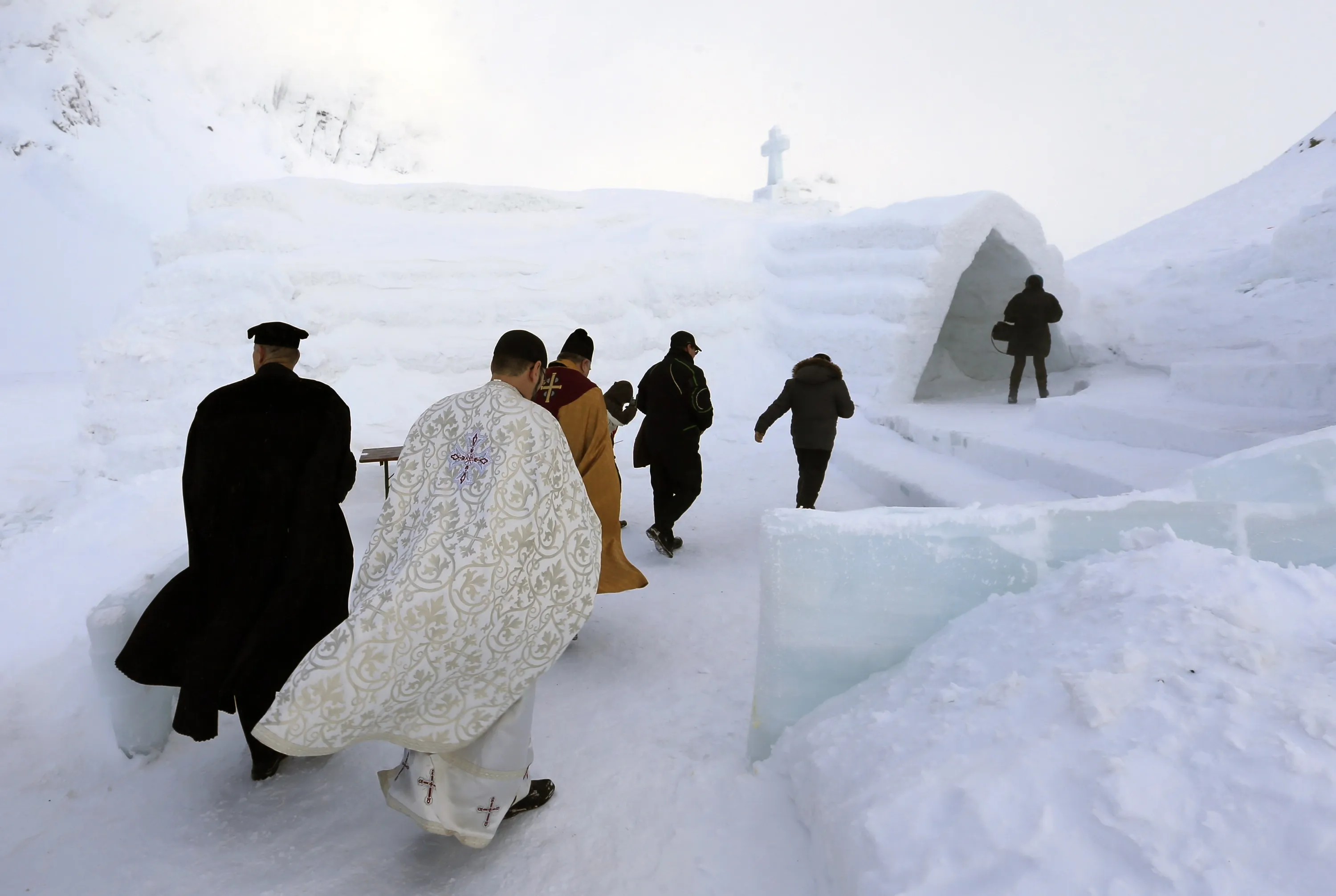 A group of priests of various congregations arrive for the inauguration of a church made entirely from ice at Balea Lac resort in the Fagaras mountains January 29, 2015. (Photo by Radu Sigheti/Reuters)
