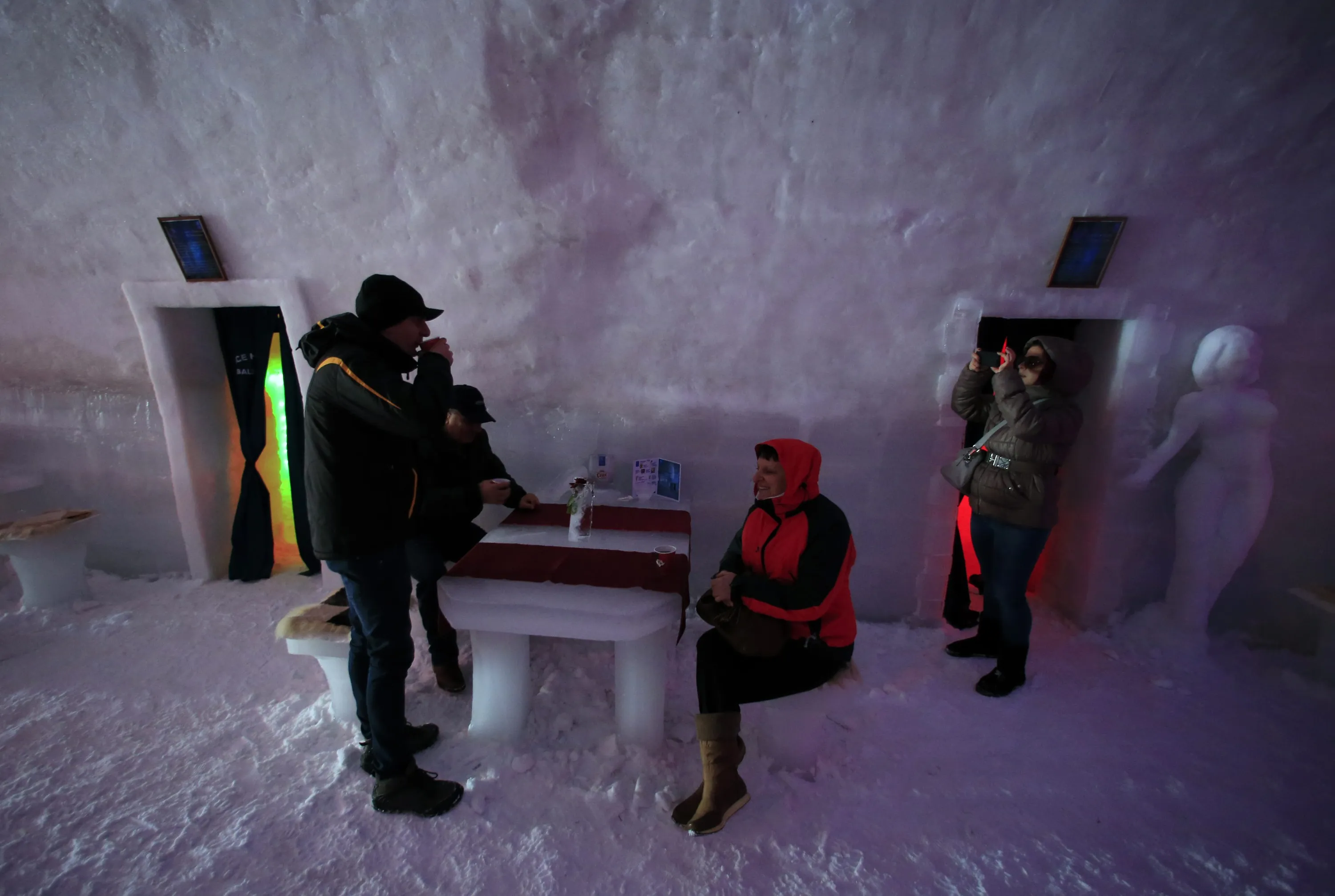 Tourists drink warm beverages and take pictures inside the Balea Lac Hotel of Ice in the Fagaras mountains January 29, 2015. (Photo by Radu Sigheti/Reuters)